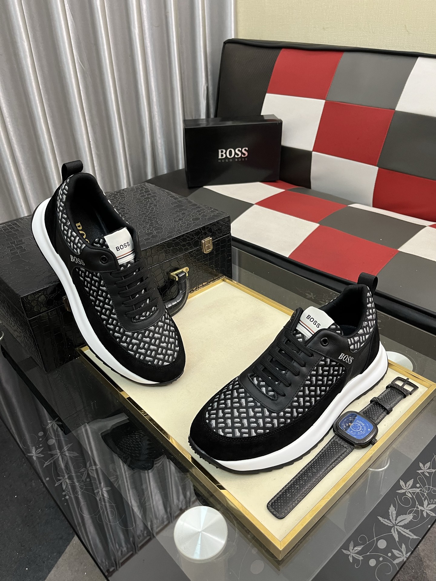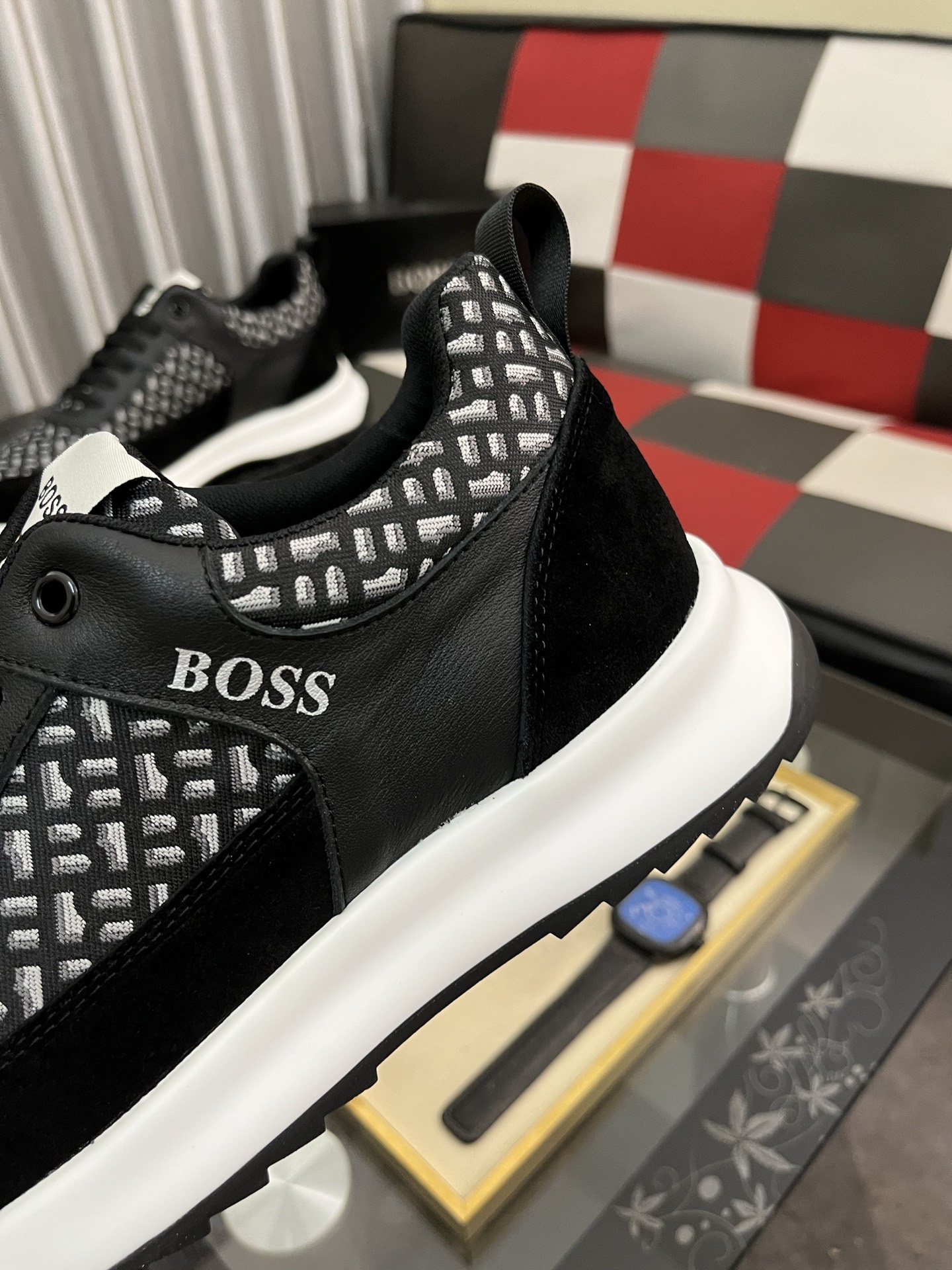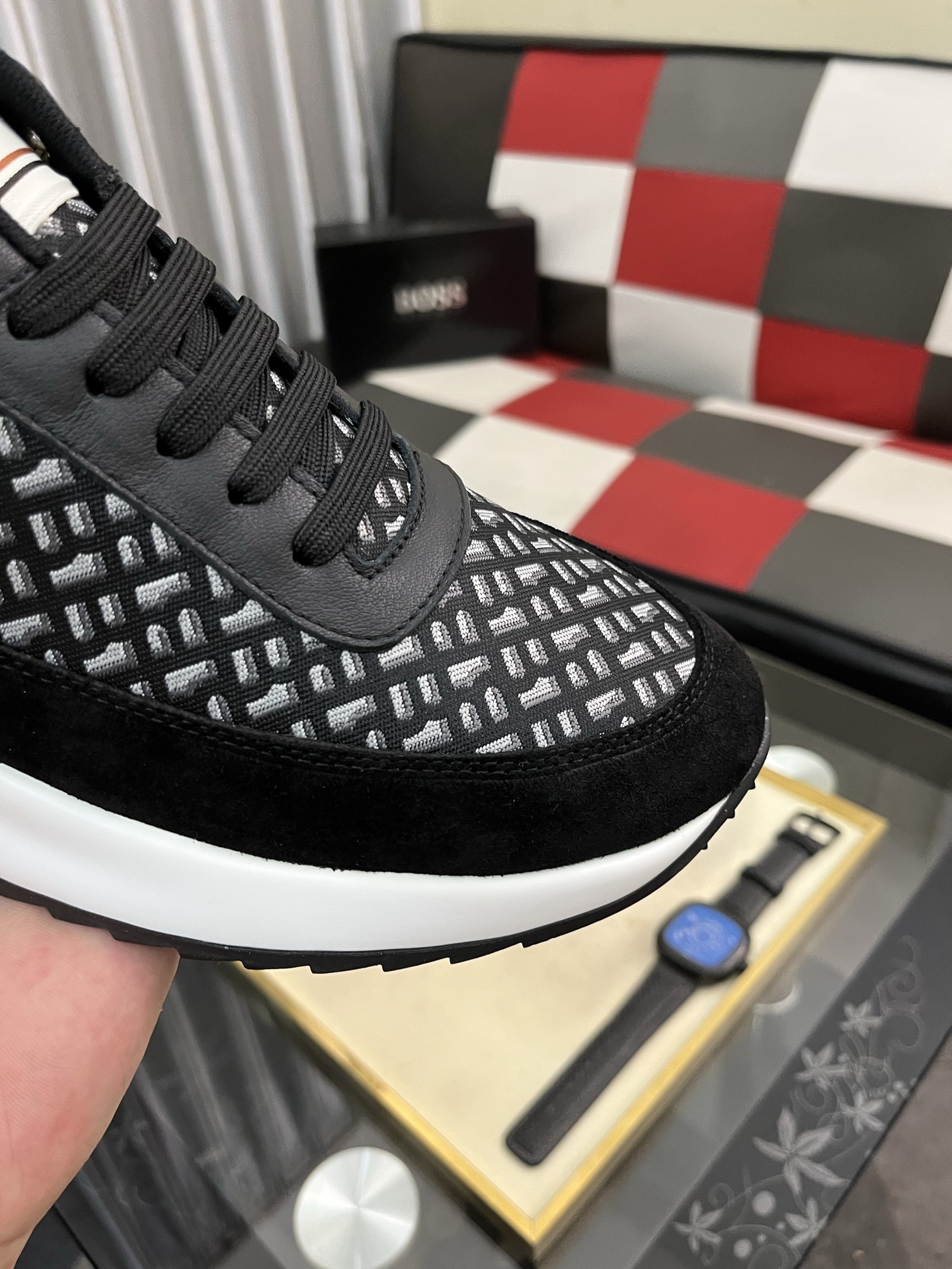 高級感のある HUGO BOSS メンズスニーカー 黒 白 メッシュ デザイン ステッチ ファッションシューズ 🥾