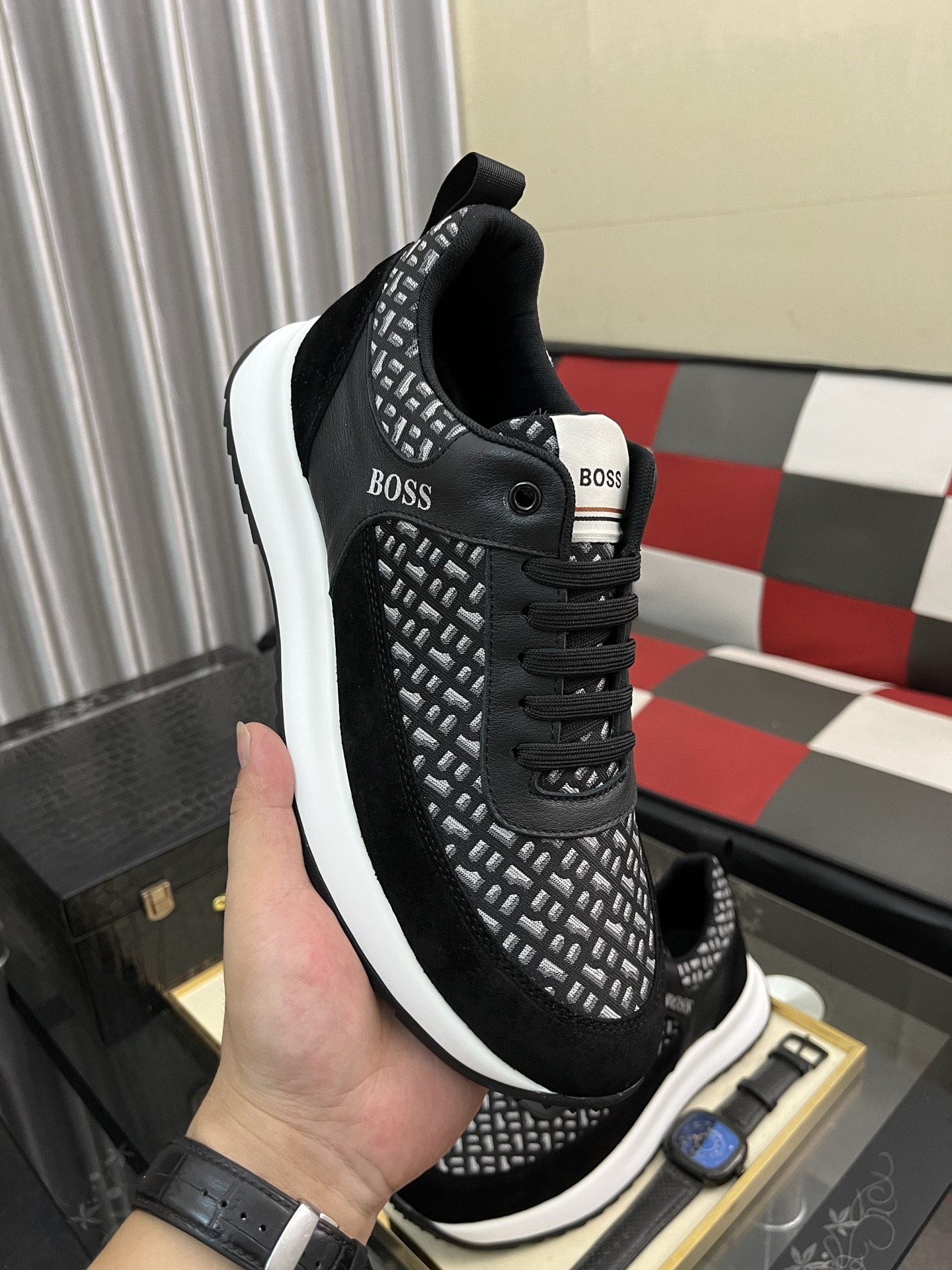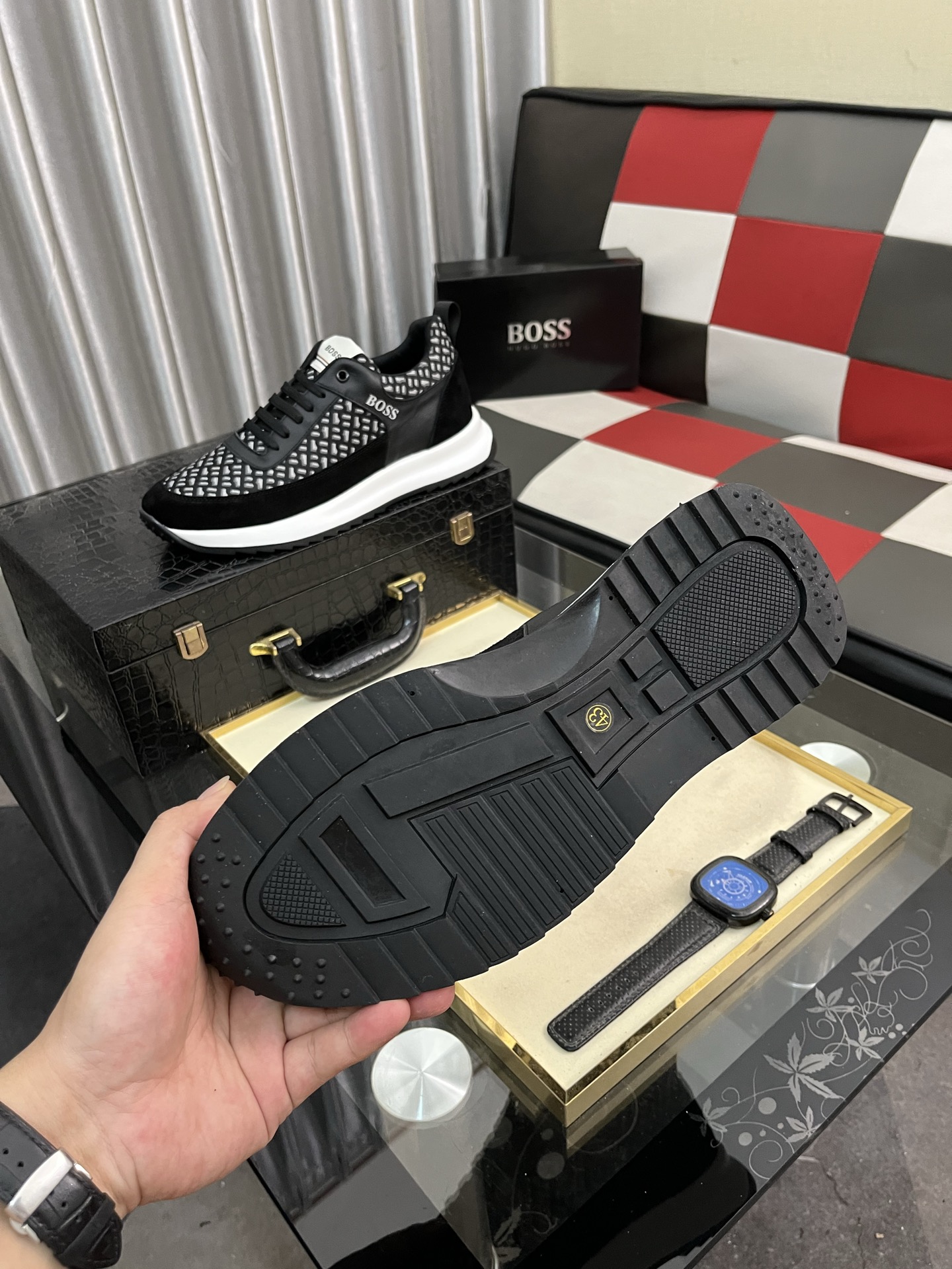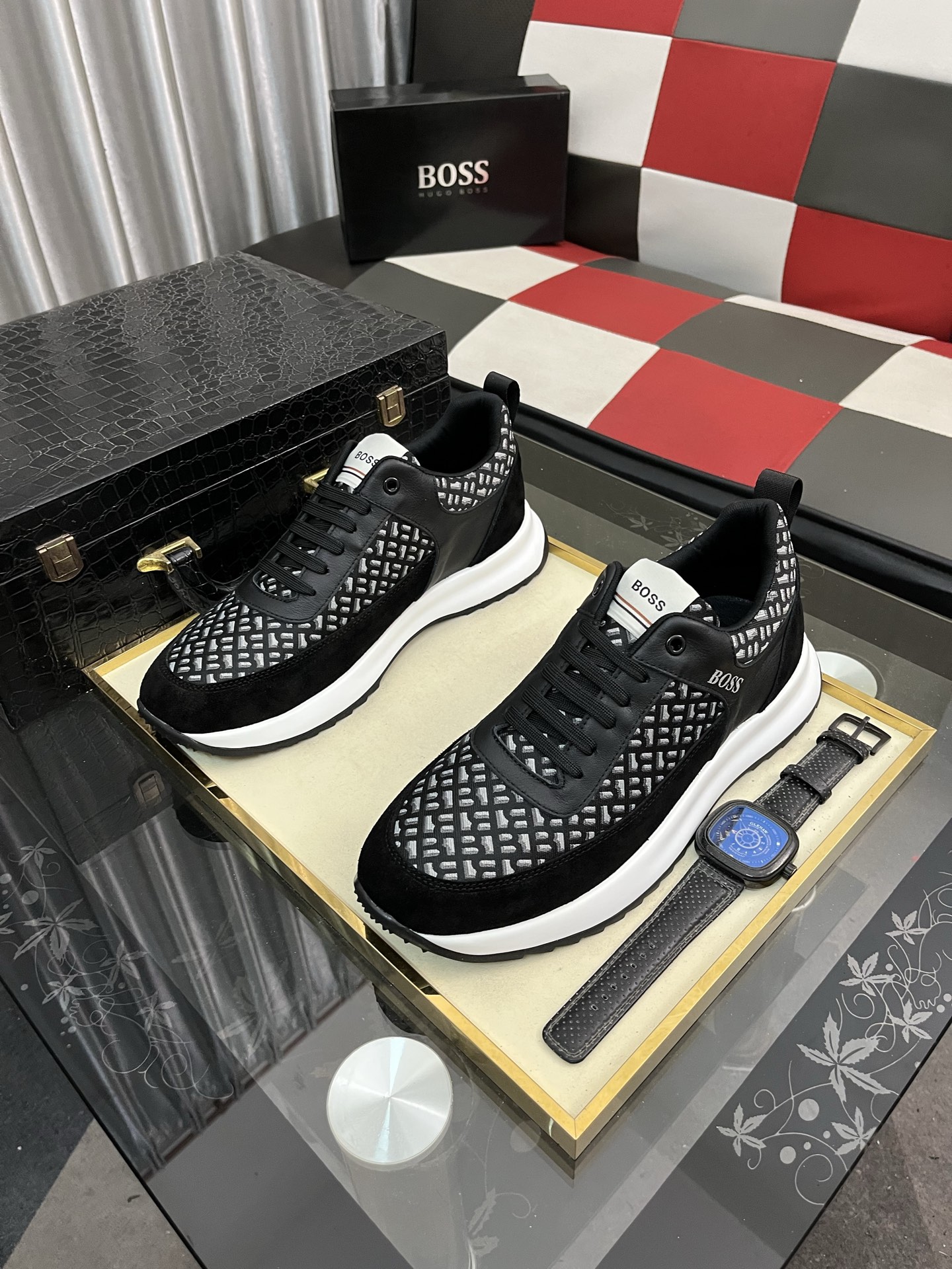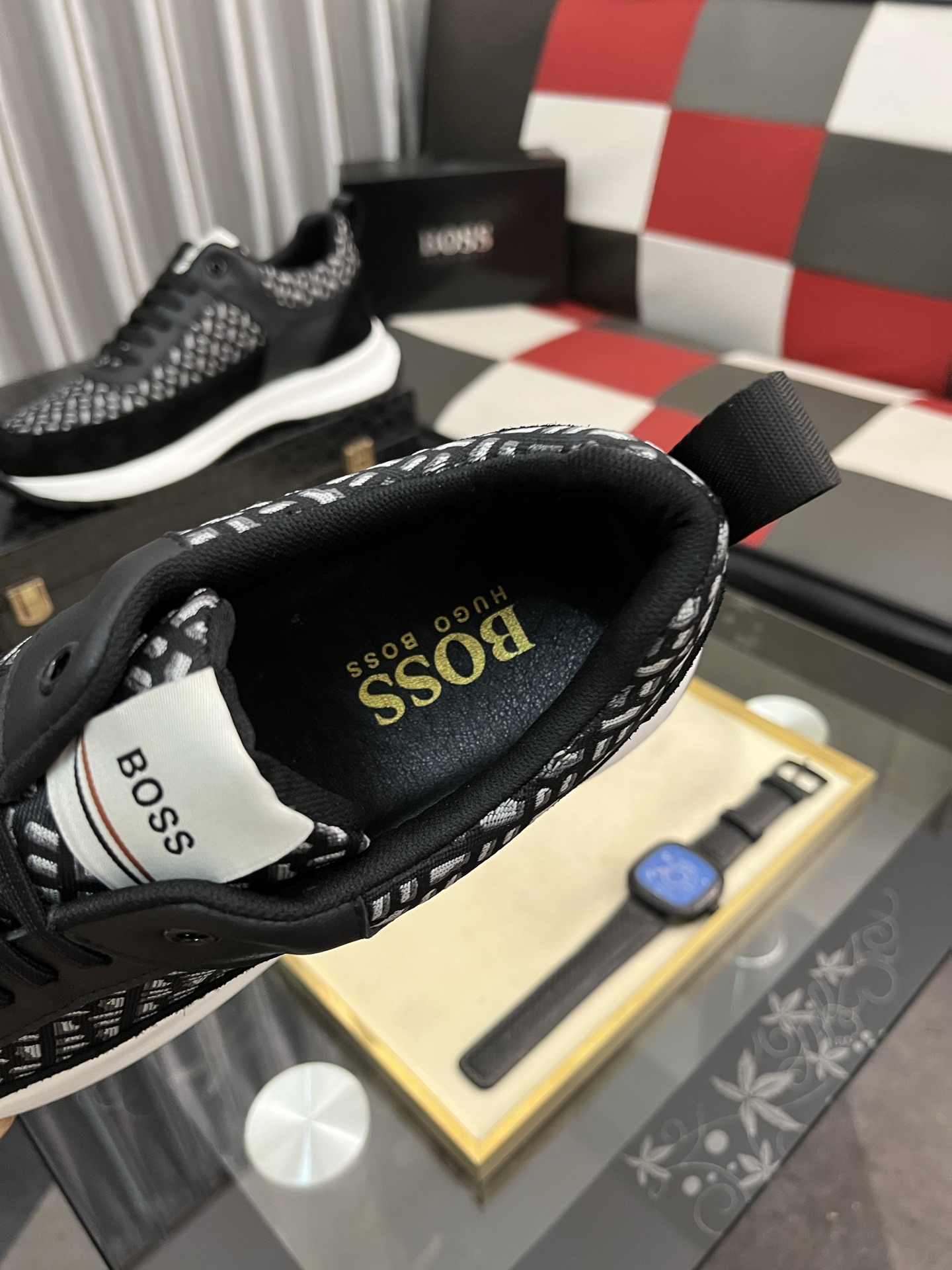 高級感のある HUGO BOSS メンズスニーカー 黒 白 メッシュ デザイン ステッチ ファッションシューズ 🥾
