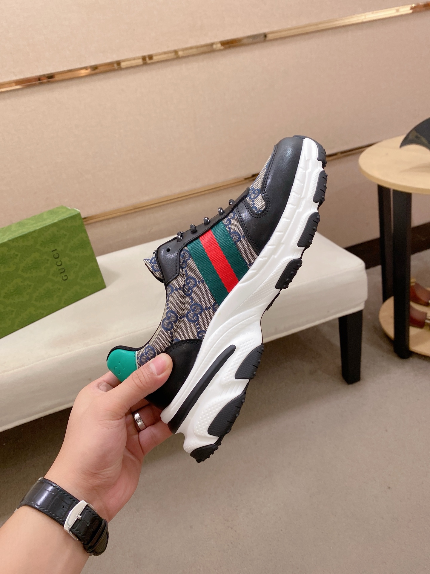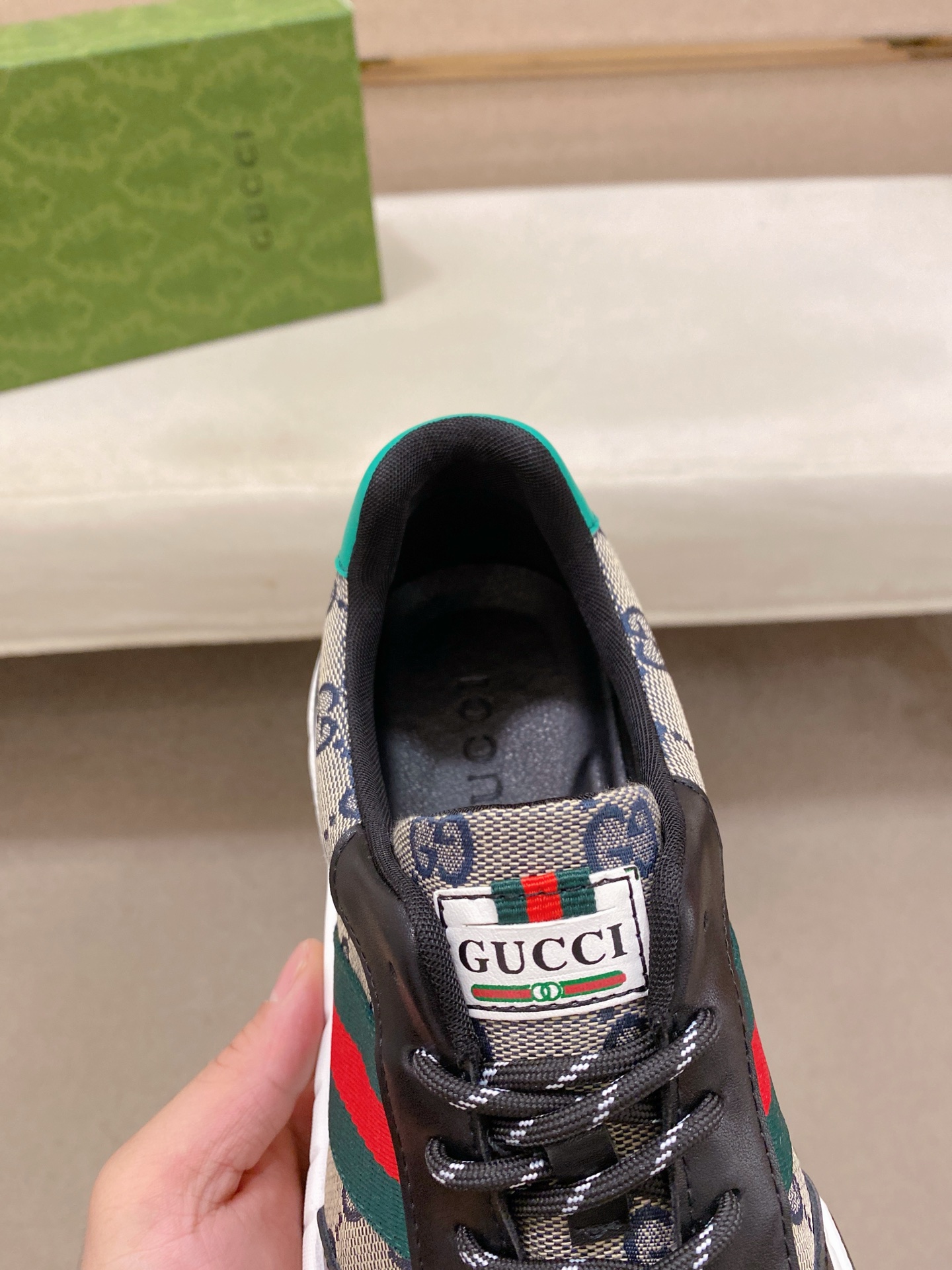 GUCCI メンズ スニーカー。黒とベージュのグッチ オールド ロゴが特徴です。赤と緑のストライプがアクセントに。