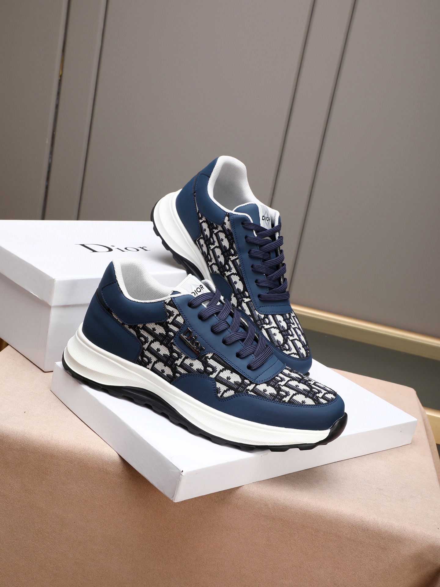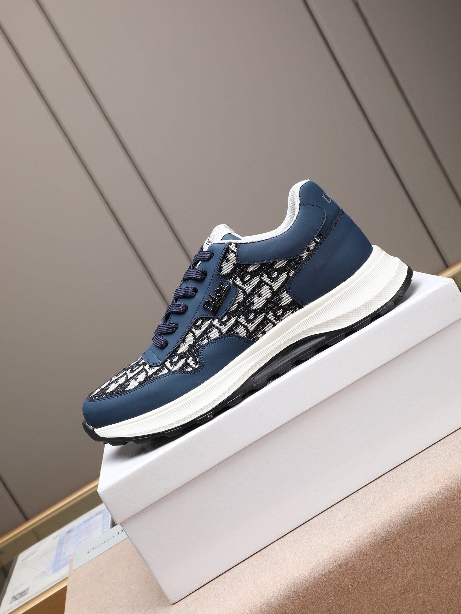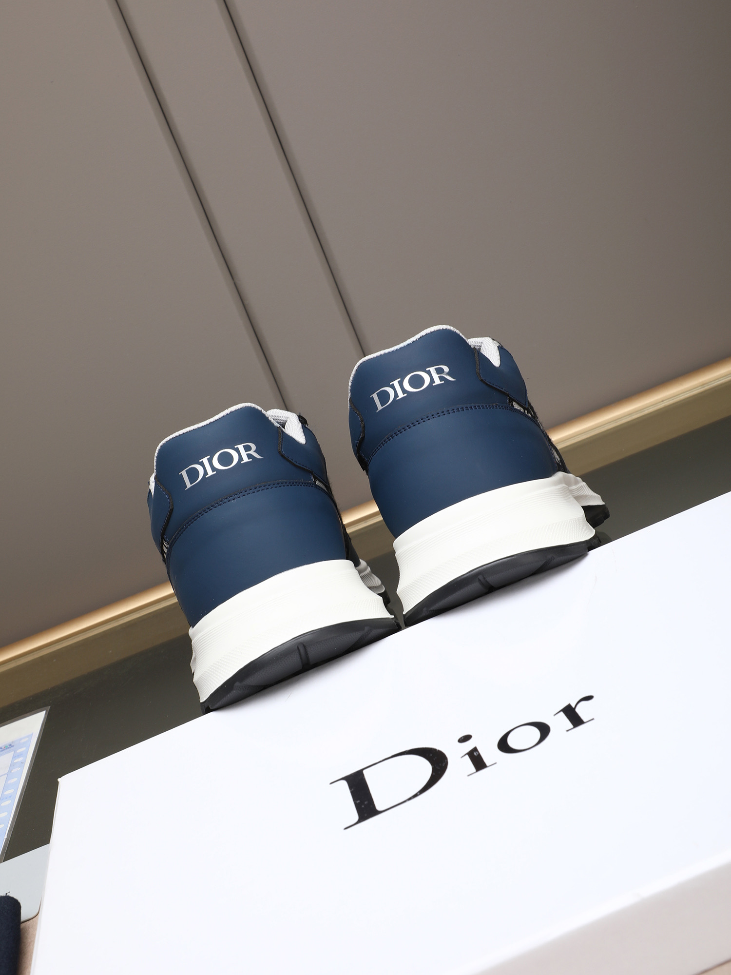Dior メンズ スニーカー。ネイビーとホワイトの配色が洗練された印象。
