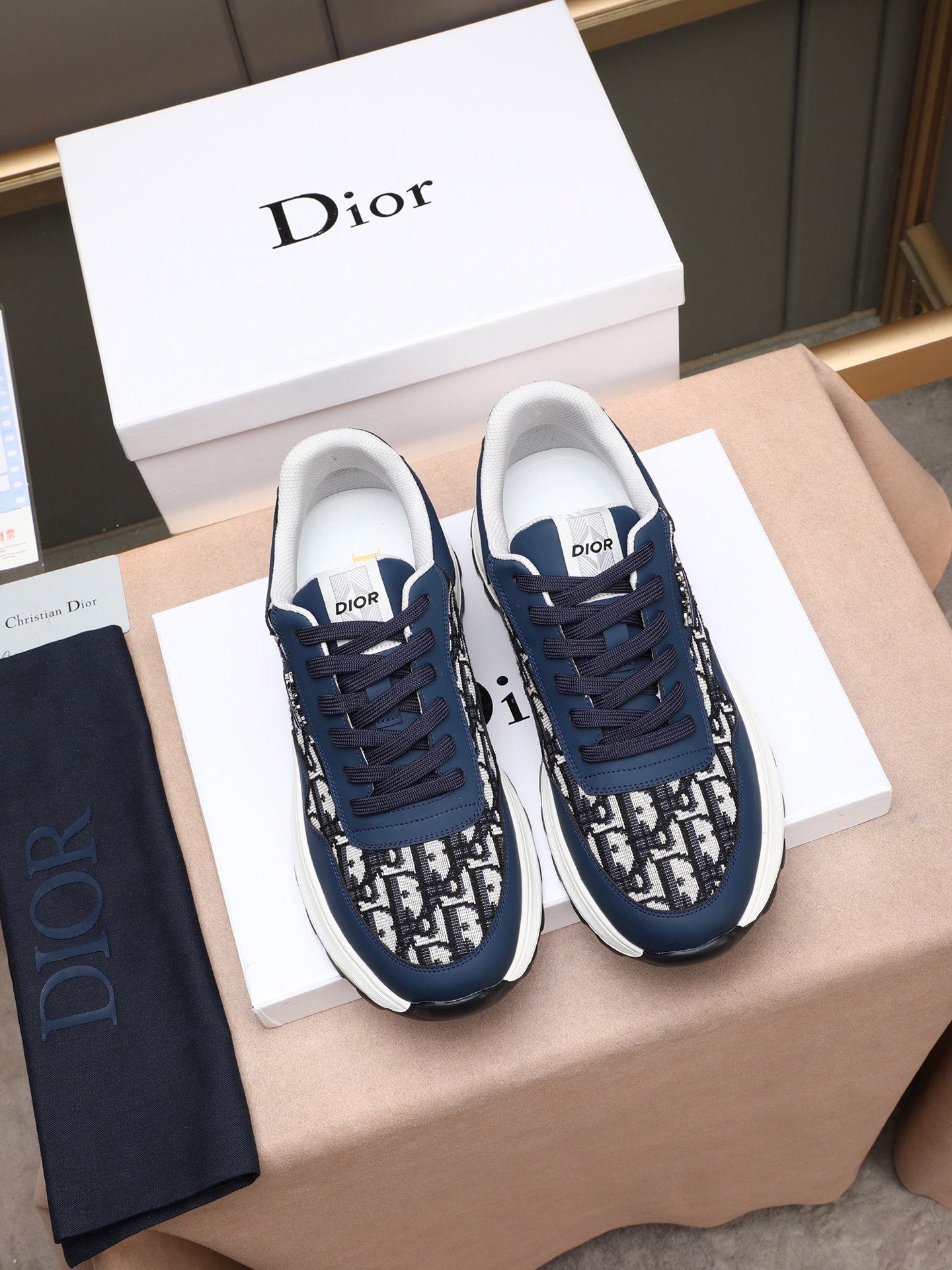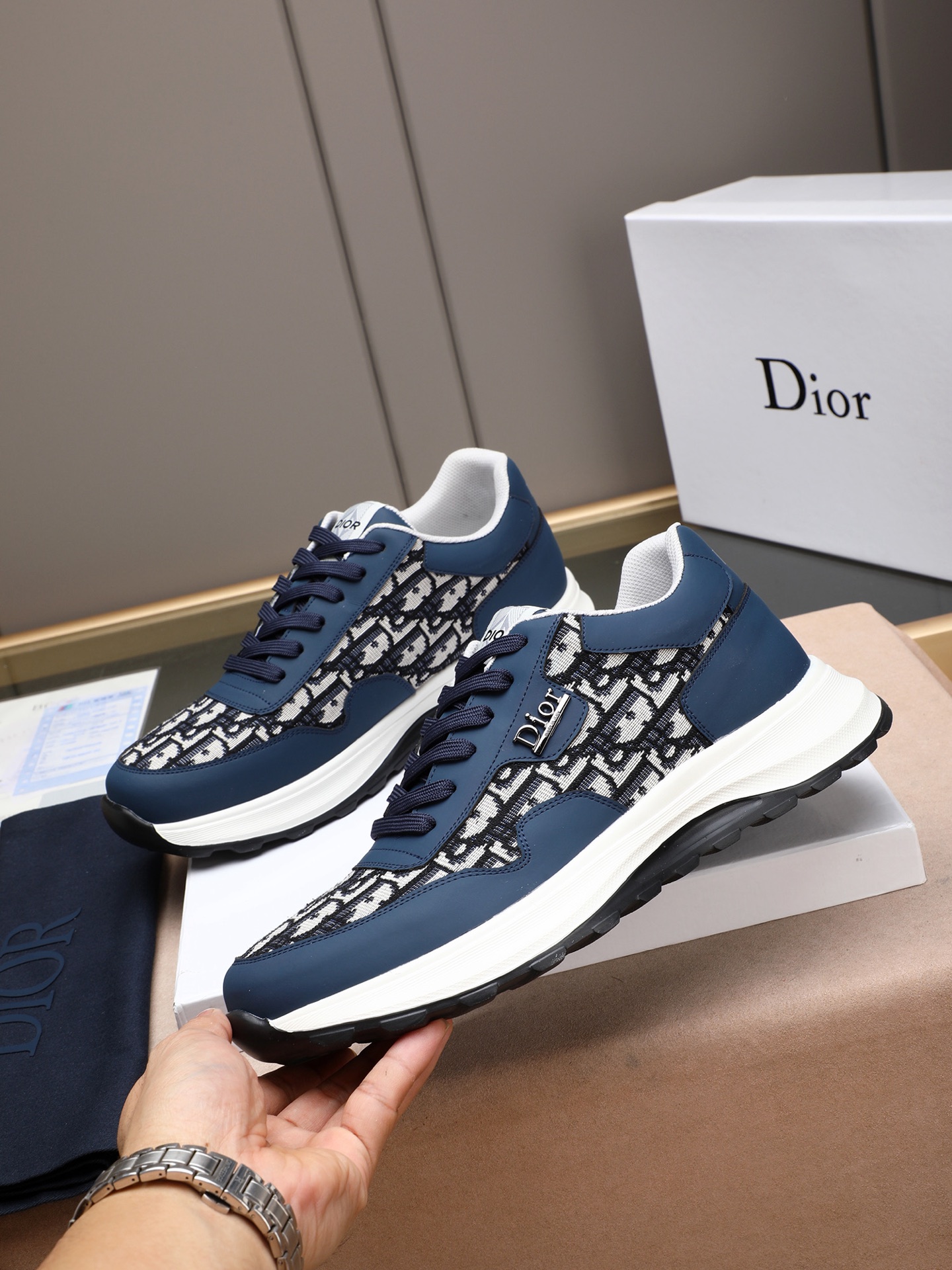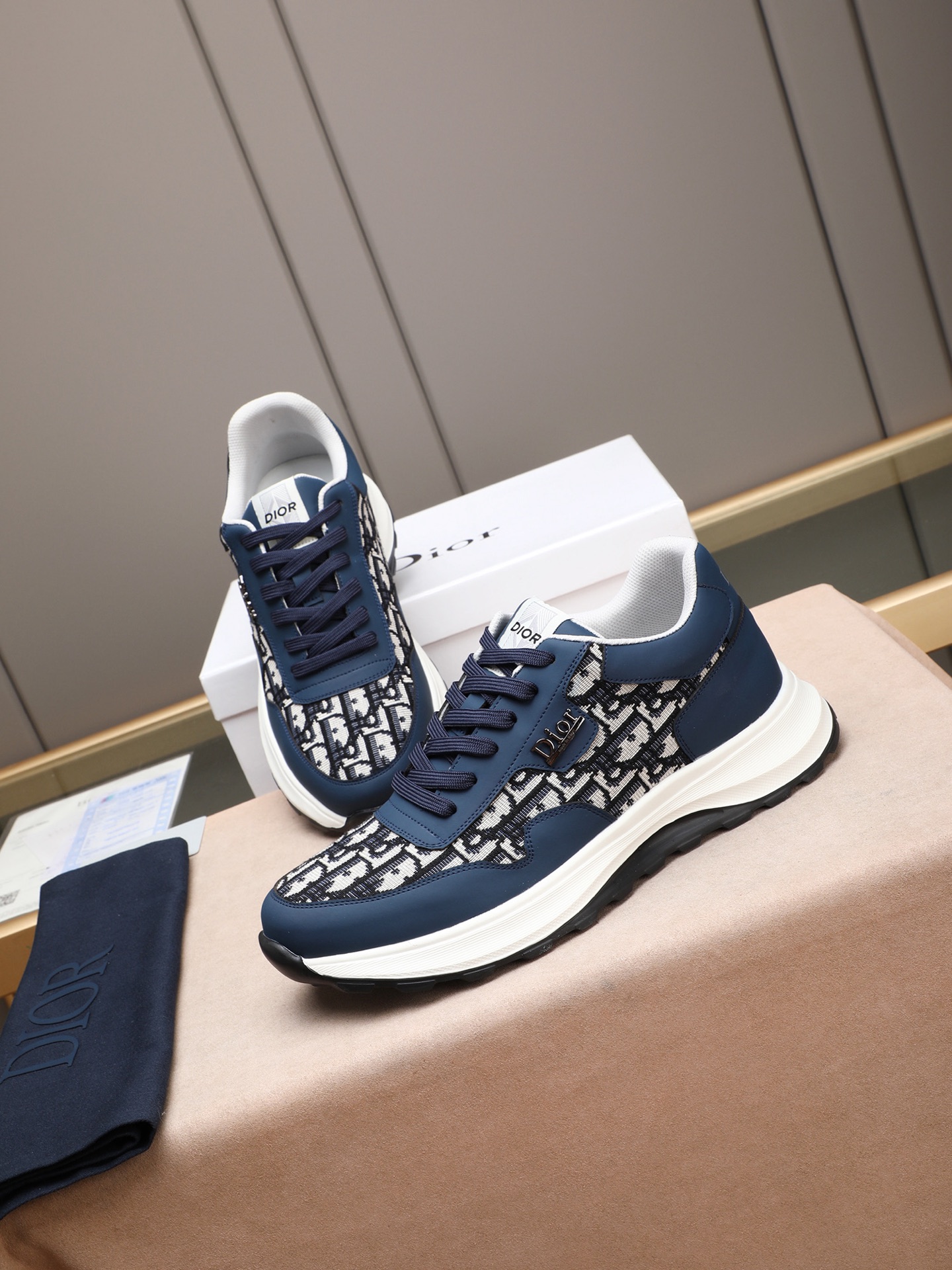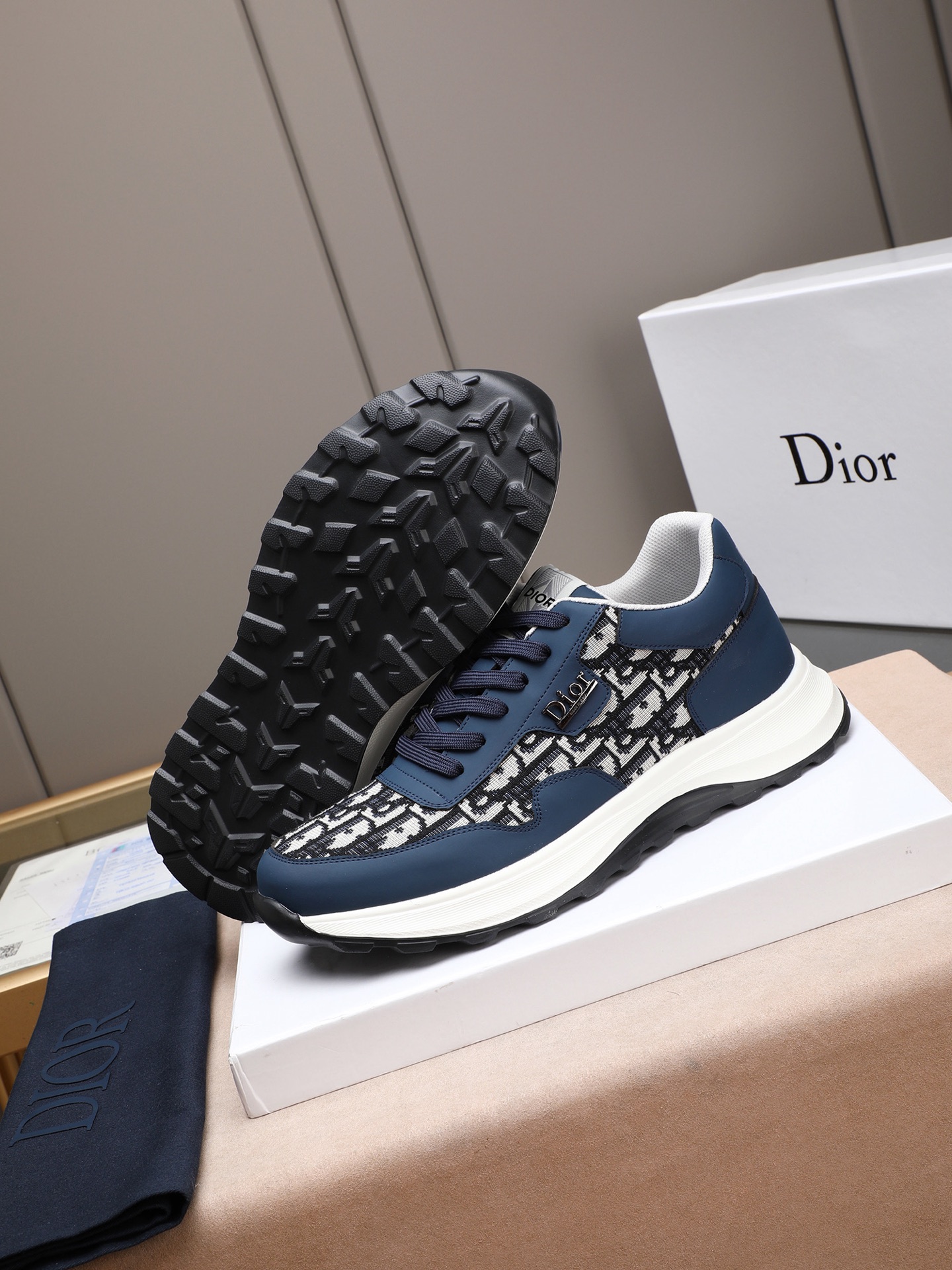 Dior メンズ スニーカー。ネイビーとホワイトの配色が洗練された印象。