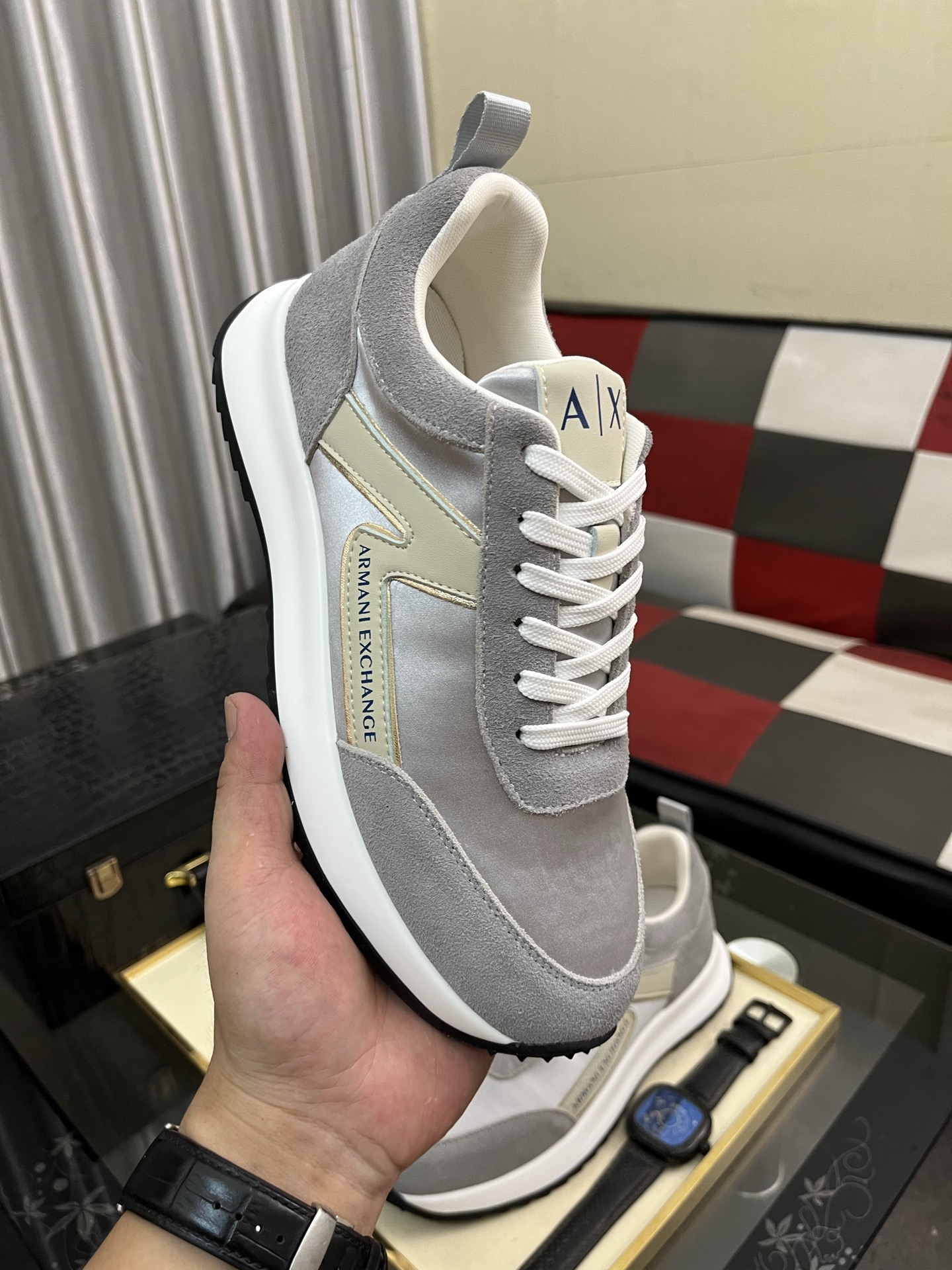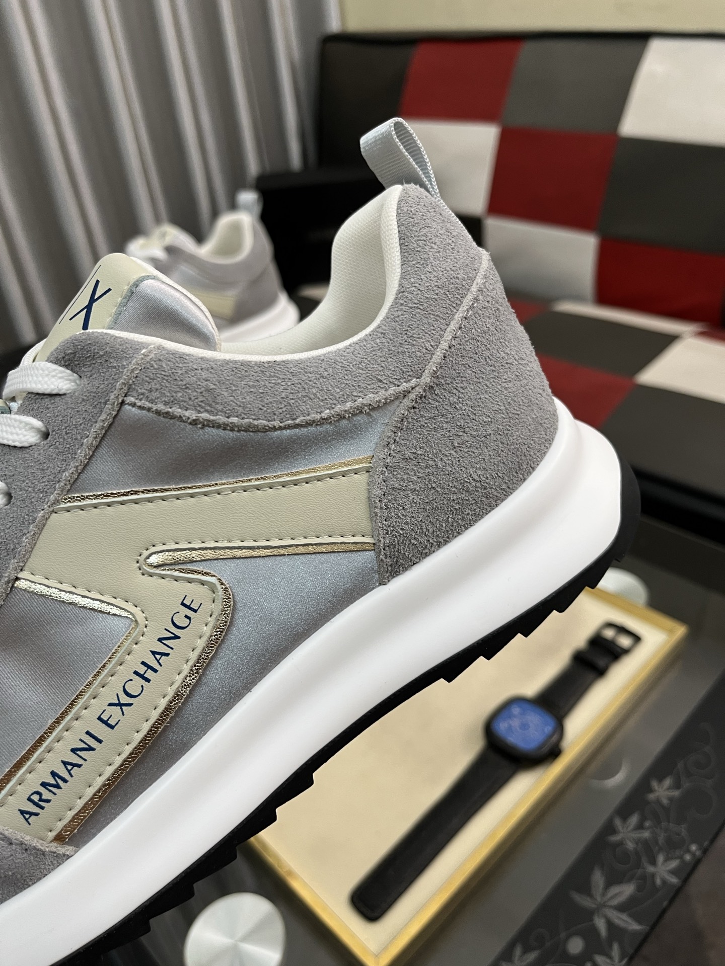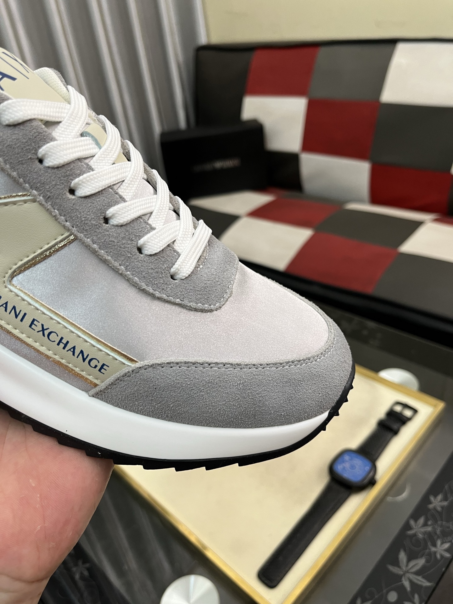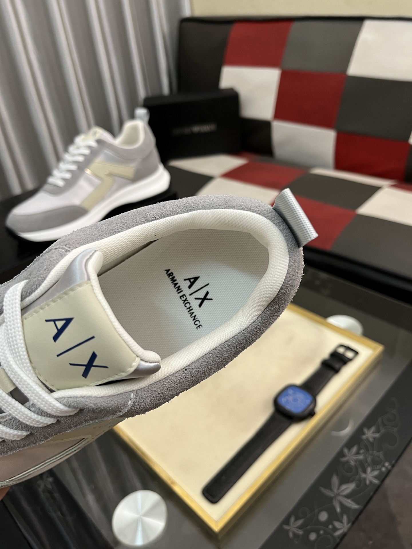 このスニーカーは、3D加工のロゴが目を引くのが特徴。グレーとホワイトの配色も、どんなスタイルにも合わせやすいです。アーミニ エクスチェンジのロゴが入っているので、ブランドの