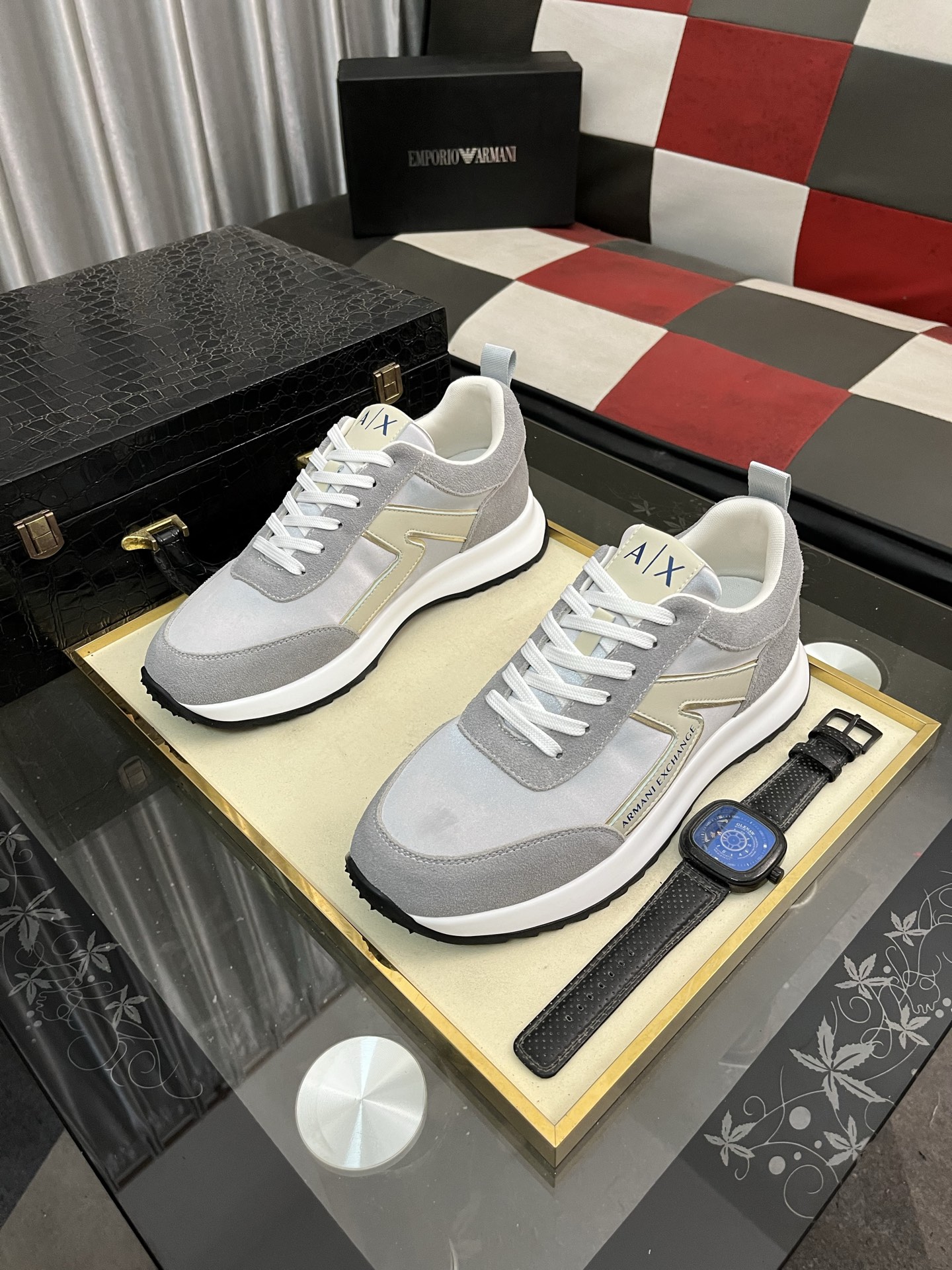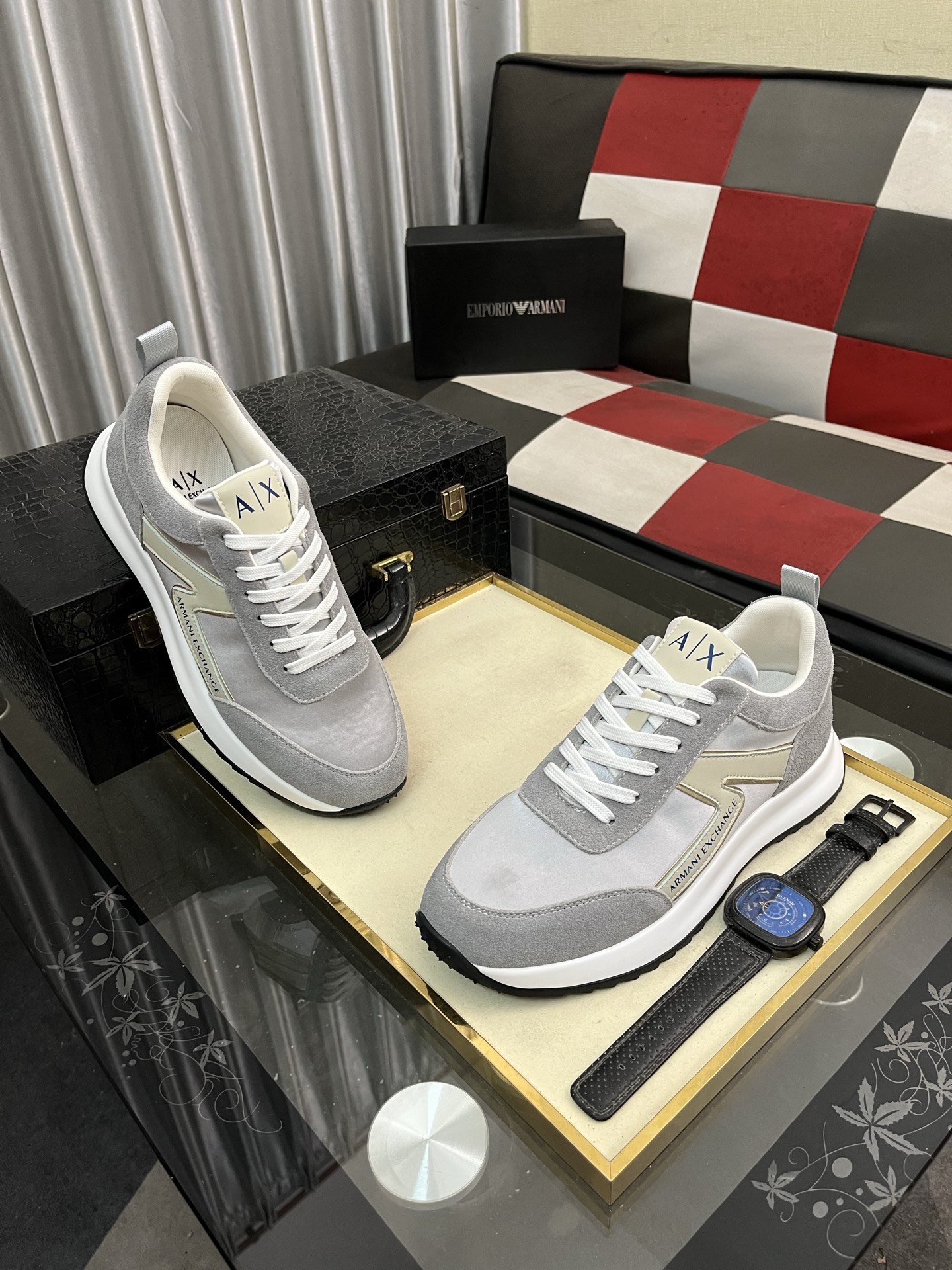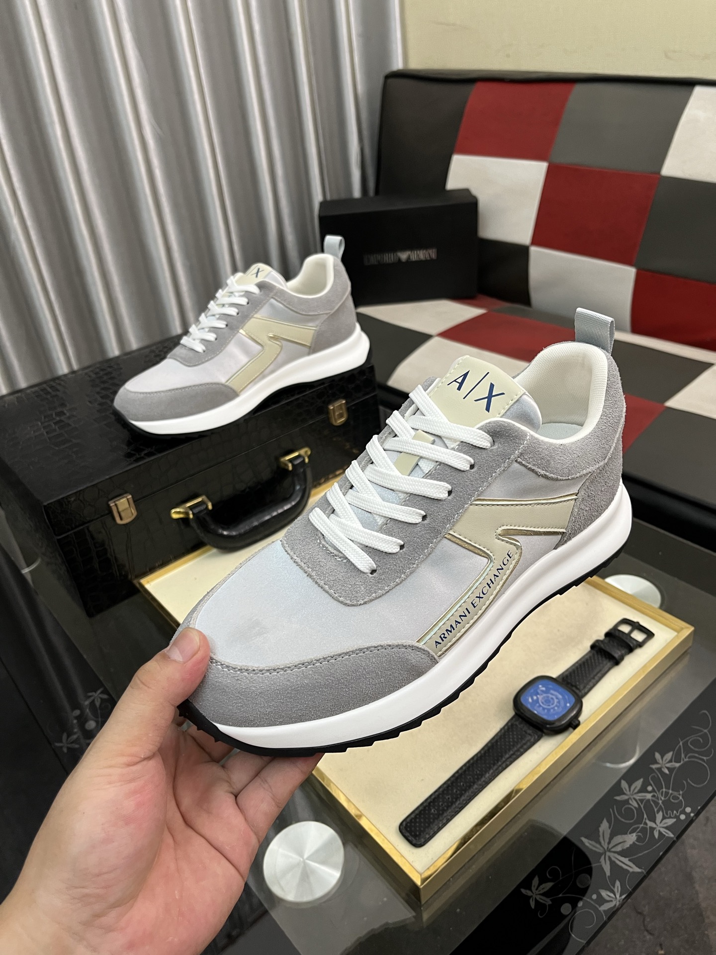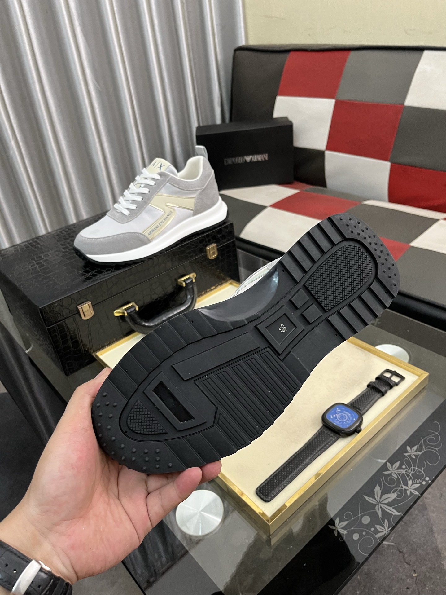 このスニーカーは、3D加工のロゴが目を引くのが特徴。グレーとホワイトの配色も、どんなスタイルにも合わせやすいです。アーミニ エクスチェンジのロゴが入っているので、ブランドの