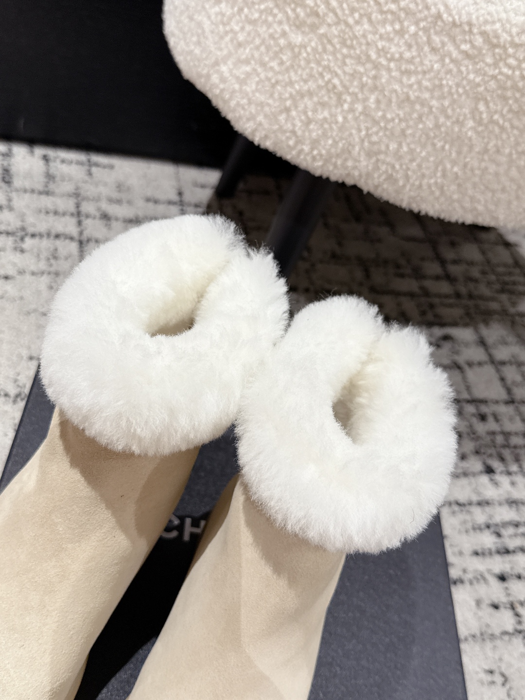 このブーツは、シャネル風のデザインが特徴的なレディースブーツです。柔らかなベージュのスエード素材に、ブラックのコントラストが美しい2トーン仕様。ふわふわのファーがwrappedされており、寒い季節にぴったりの保温性を提供します。また、サイドにはブランドロゴのジッパーが施されており、さりげないアクセントになっています。