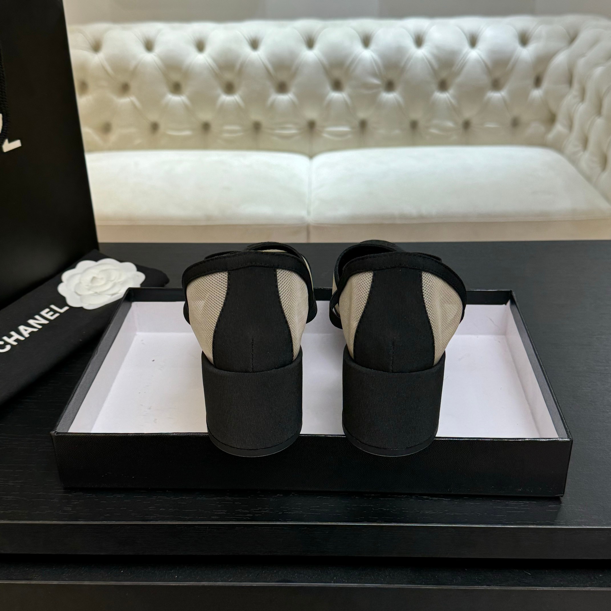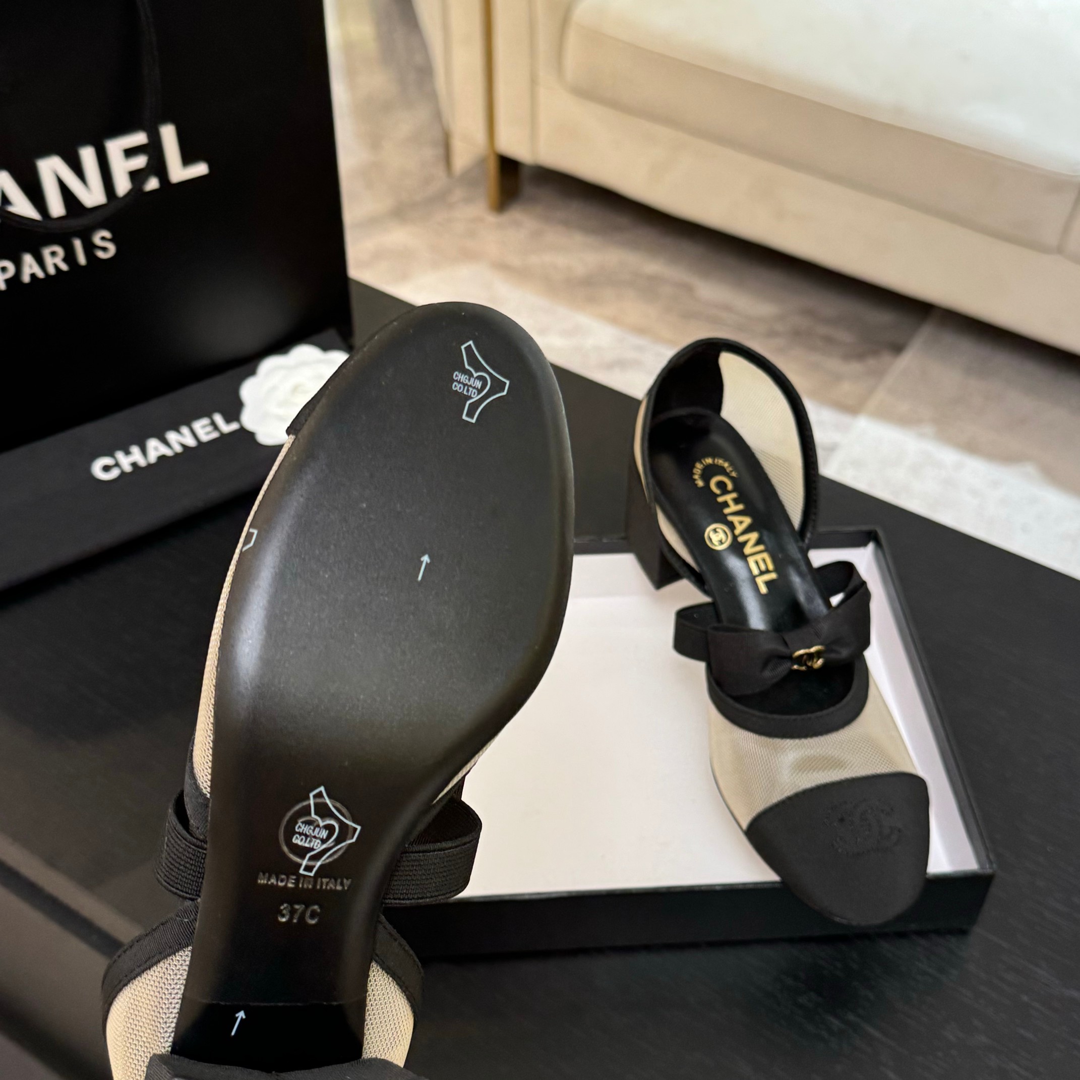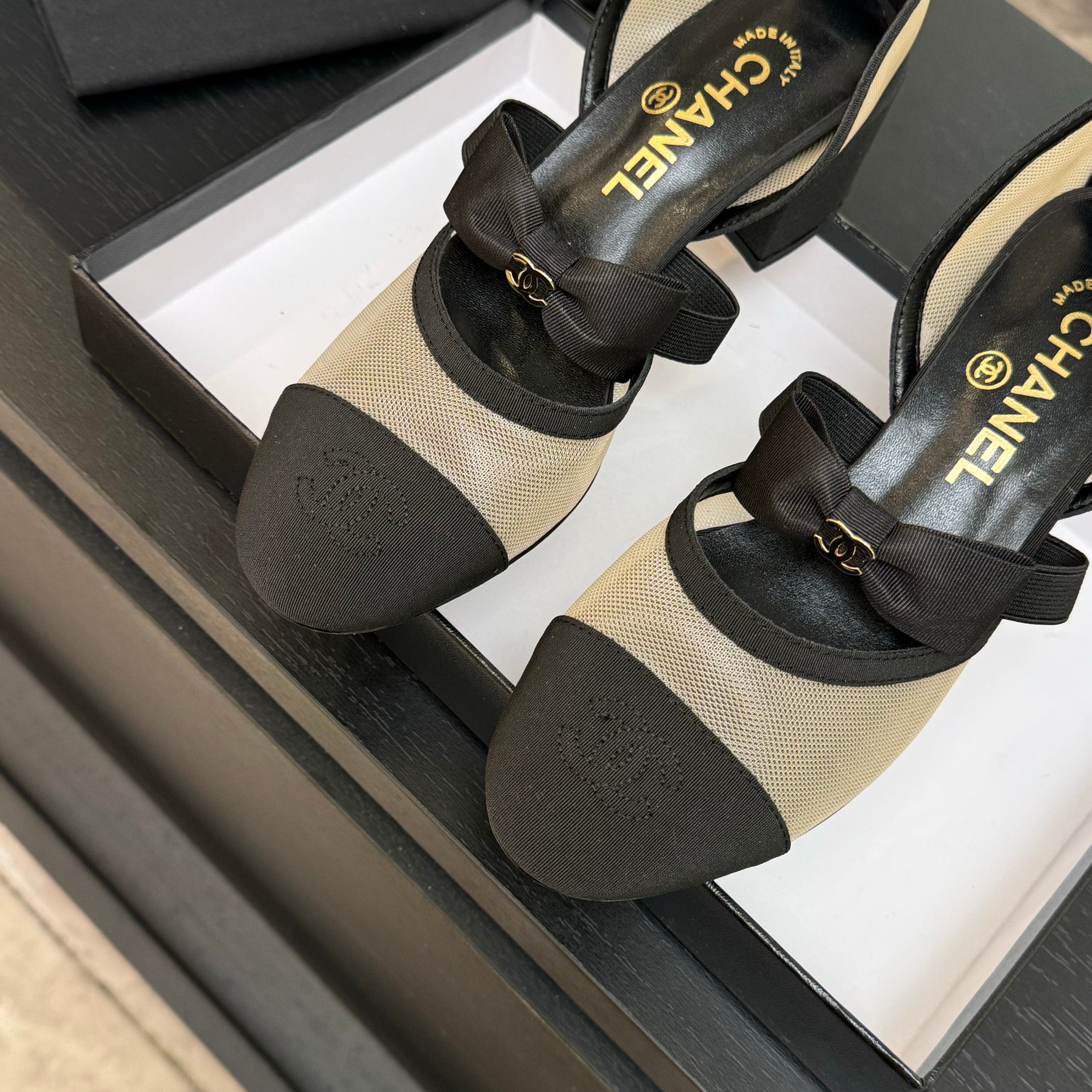 シャネルのレディースシューズは、ブラックとベージュの2色展開で、クラシックなデザインが魅力です。 ファブリック素材とリボンのディテールが、エレガントさと女性らしさを引き立てます。