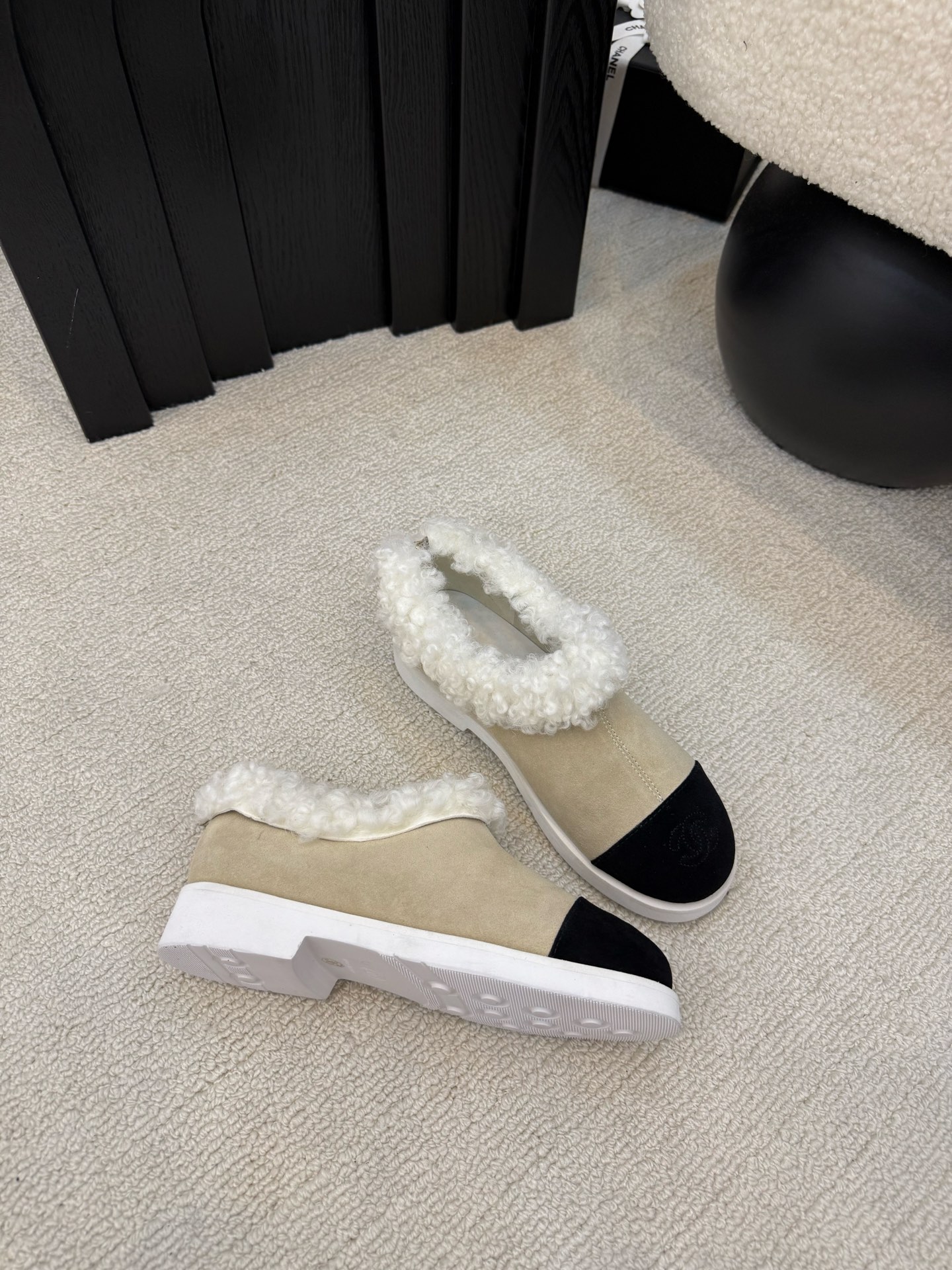 このシューズは、シャネルの特徴的なコンチネンタルデザインを採用しています。ブラウンとホワイトのバイカラーが上品な印象を与え、ふわふわのファーが足元に温もりを添えます。スエードとフェイクファーの素材が組み合わさり、高級感と快適さを兼ね備えています。
