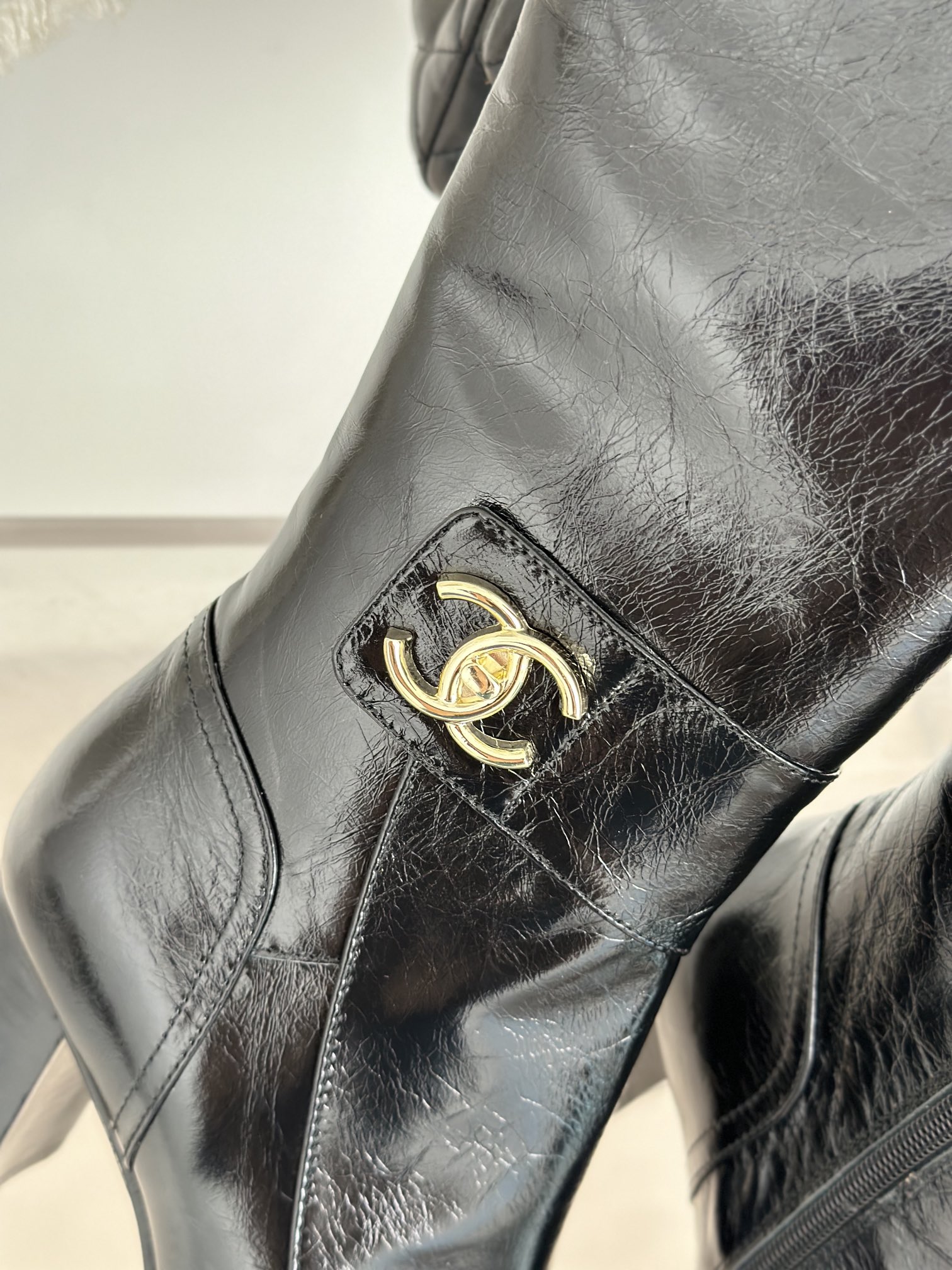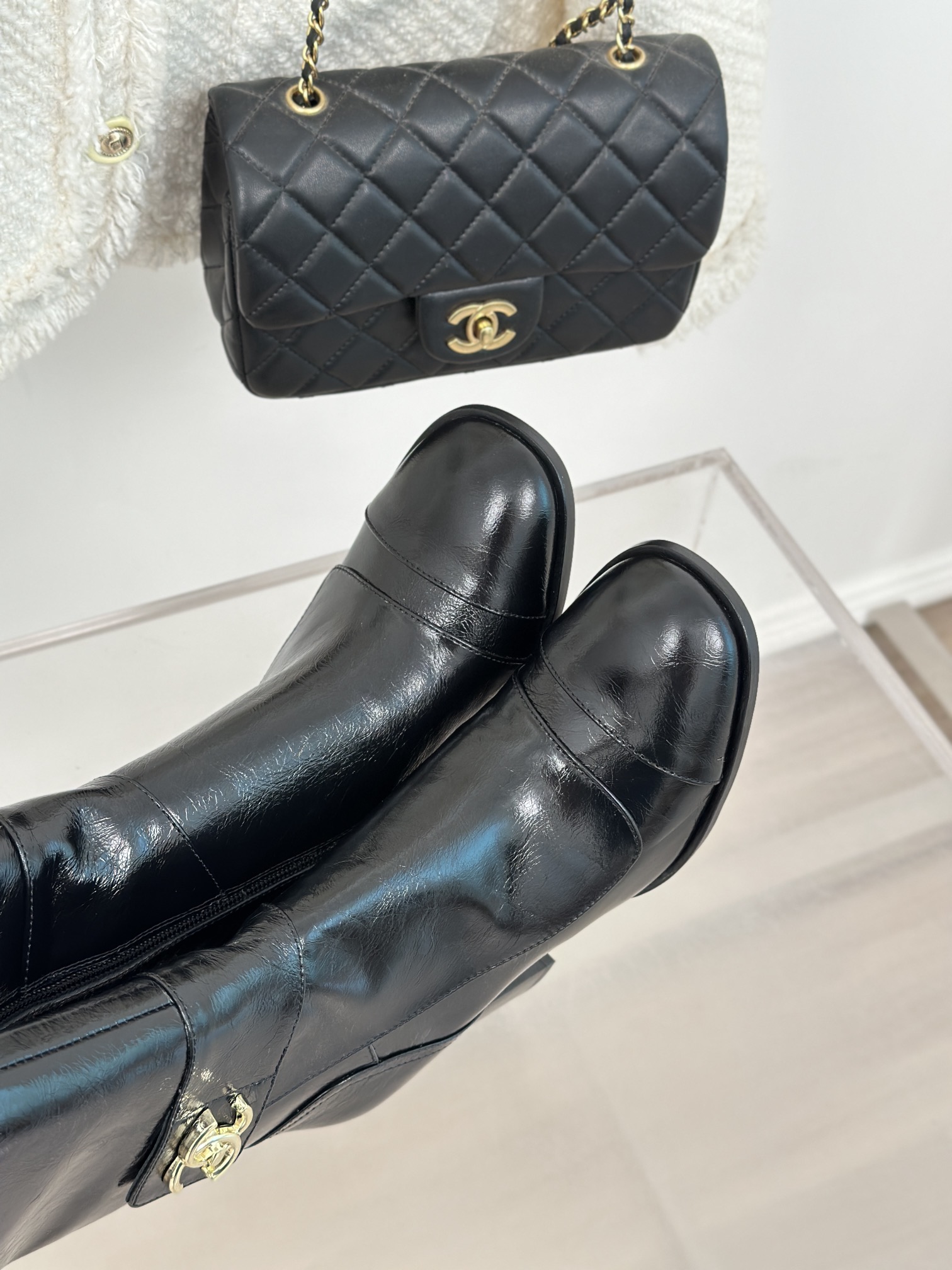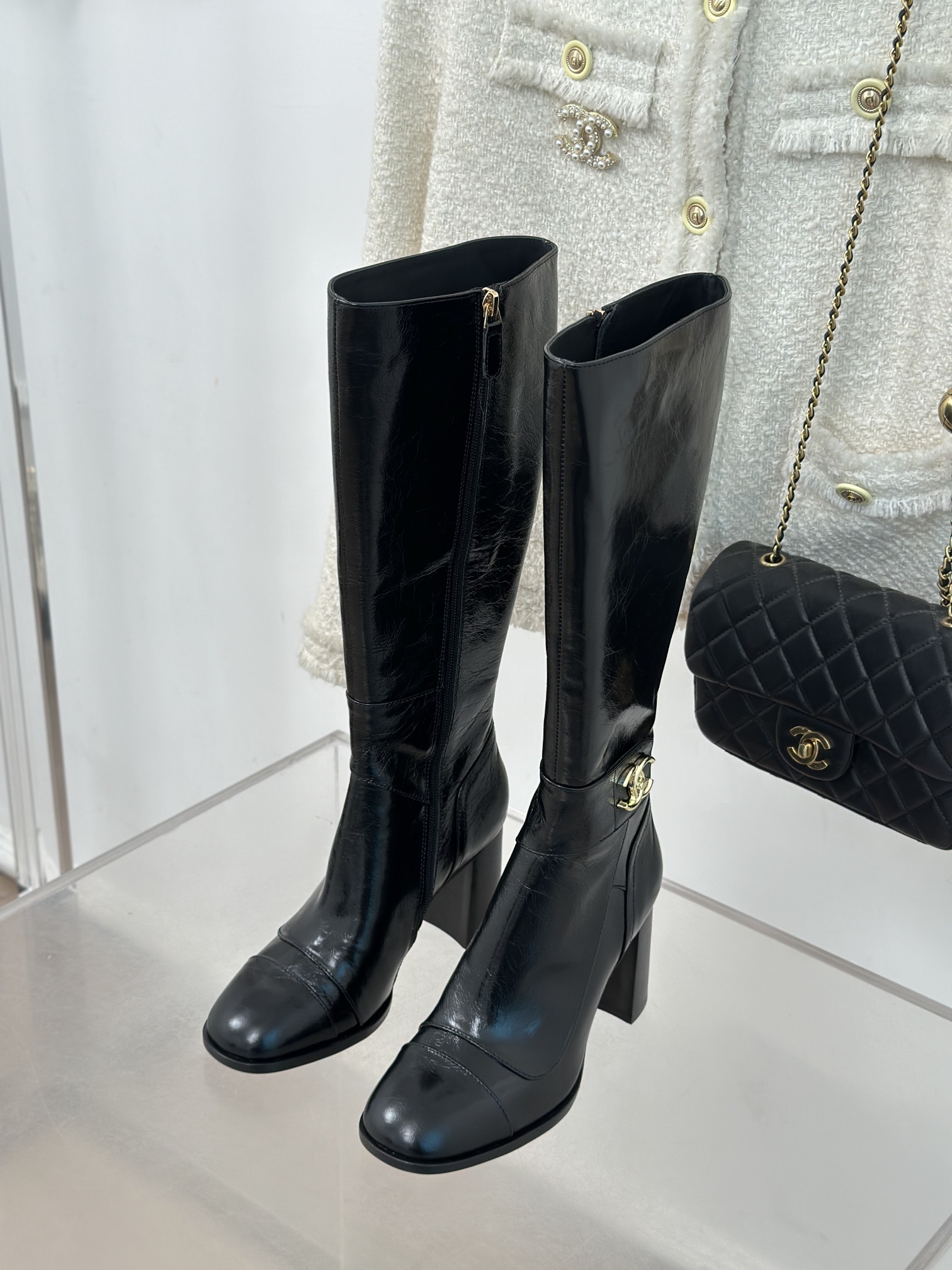 シャネルのレディース ロングブーツ、ブラック。光沢のある上質なレザーを使用しており、脚を長く見せる効果があります。