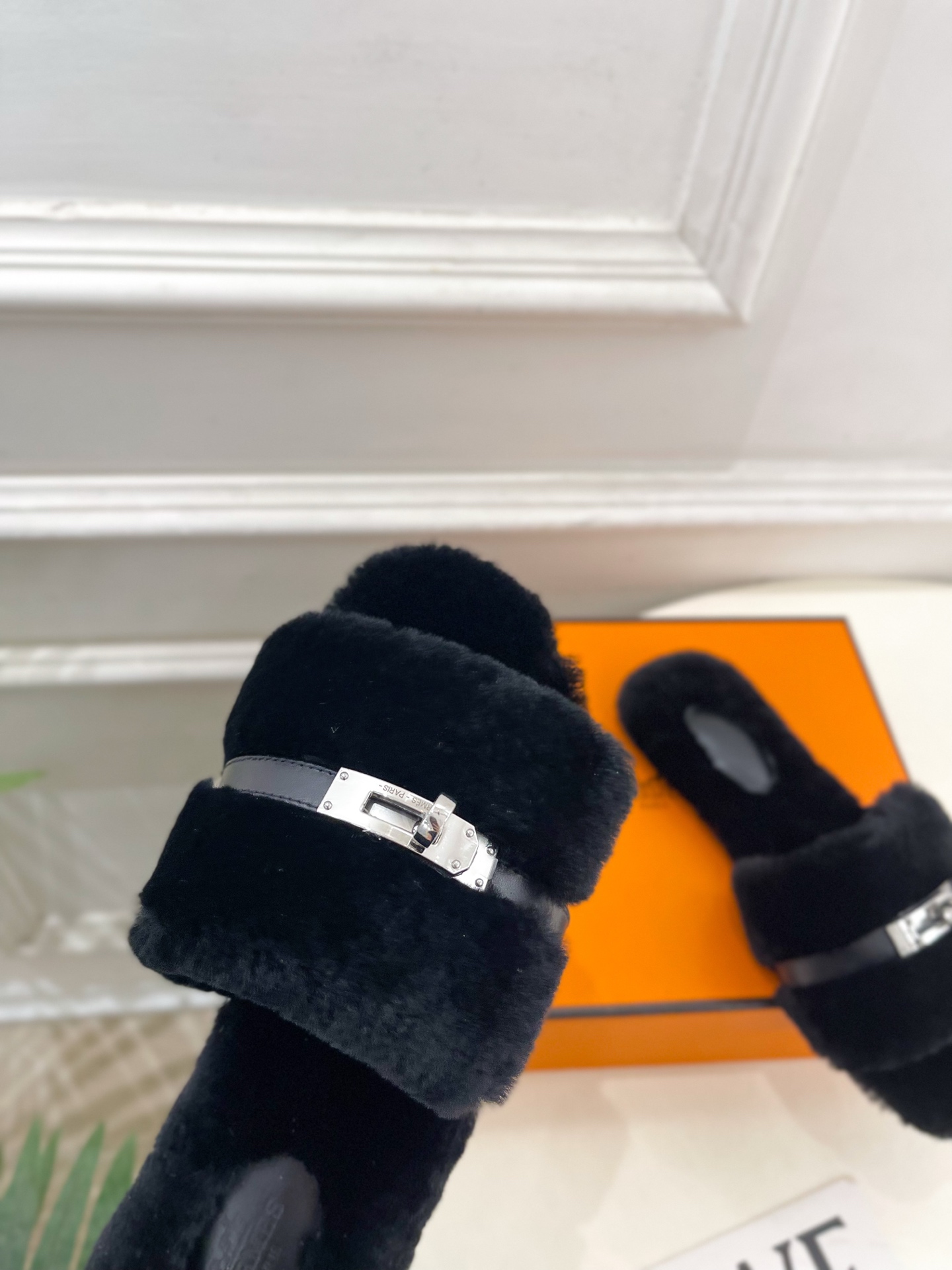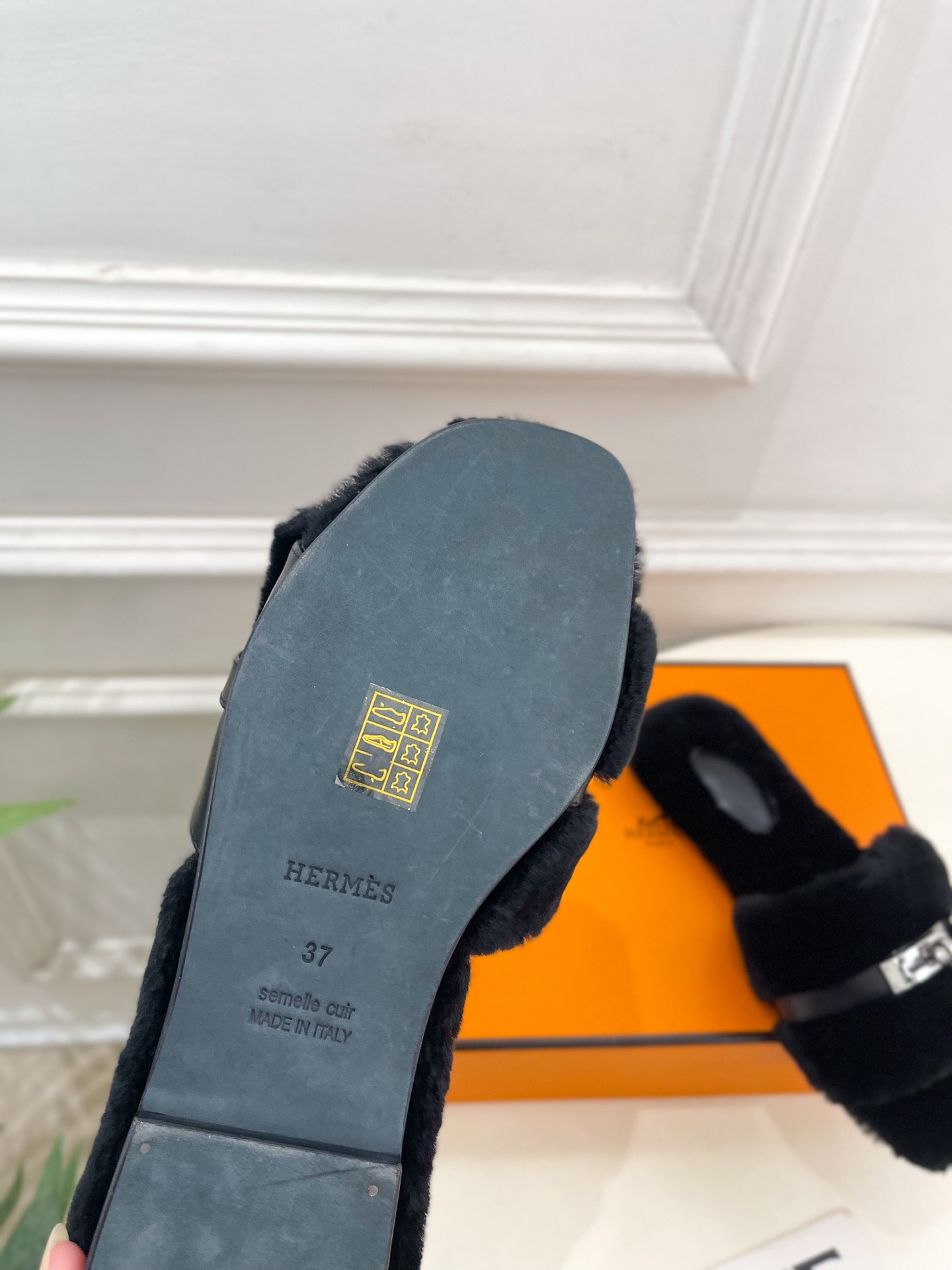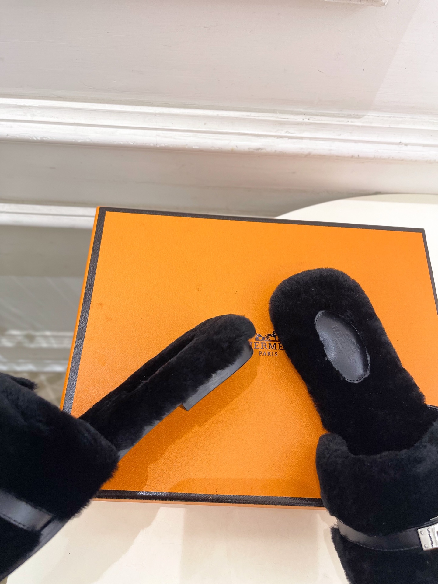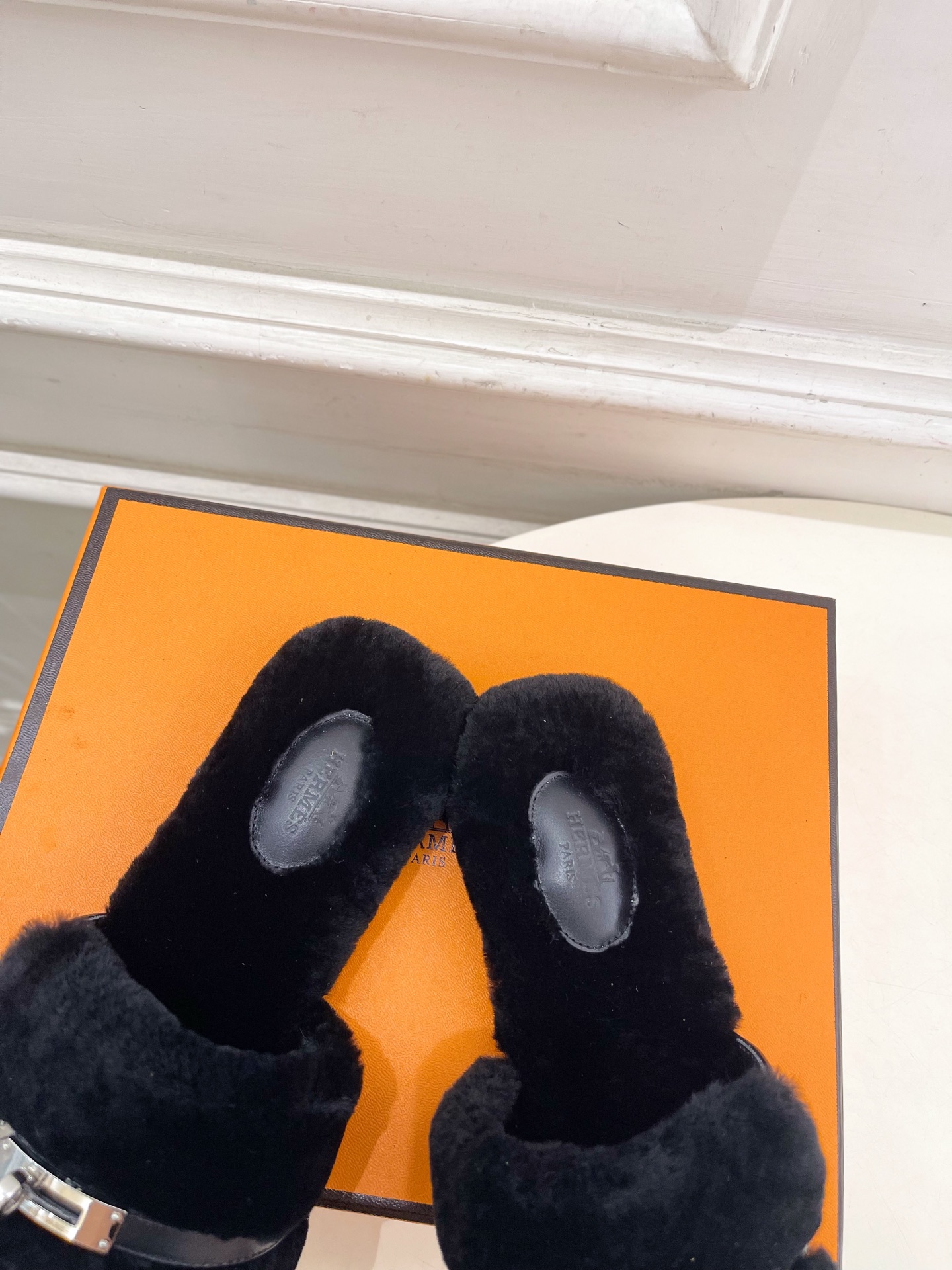 エレガントな HERMES フェイクファー フラットサンダル 黒 37サイズ 素材: フェイクファー・レザー 靴底にゴールドロゴ イタリア製 🐎
