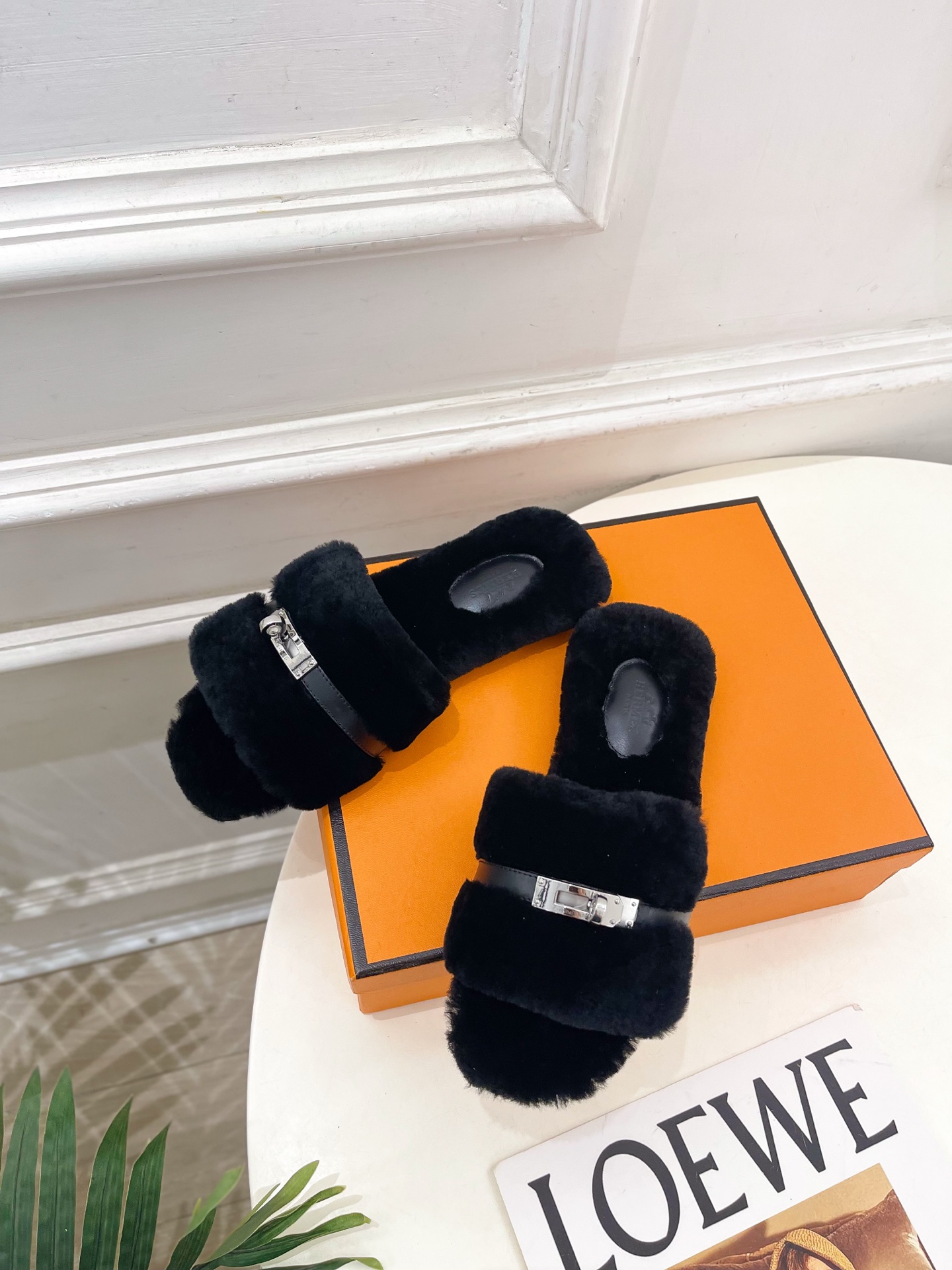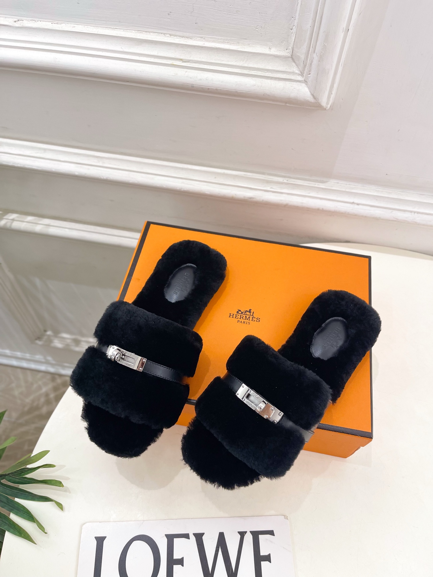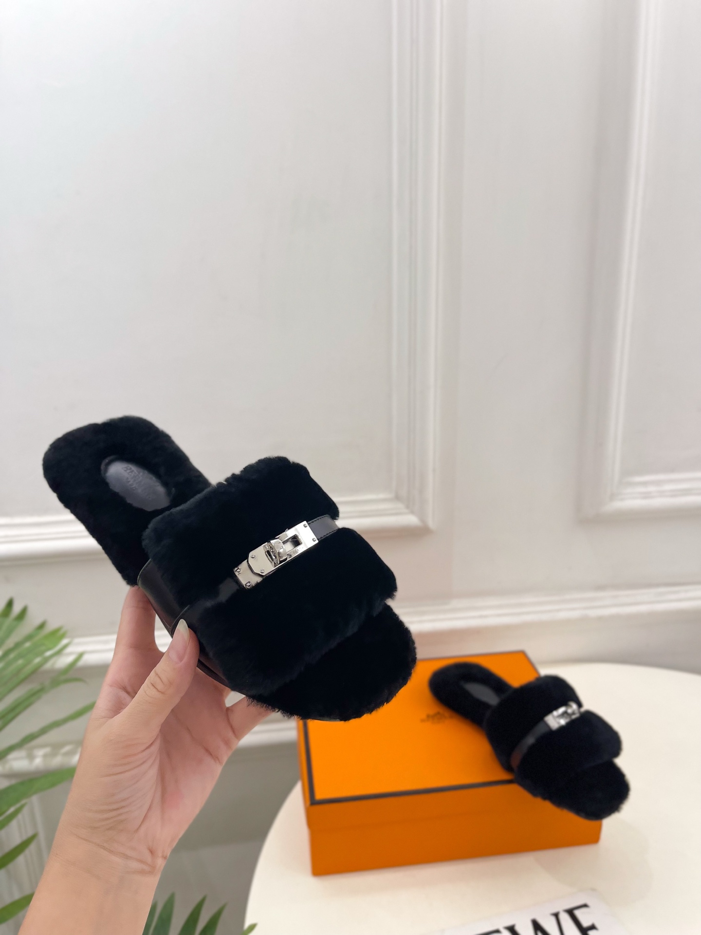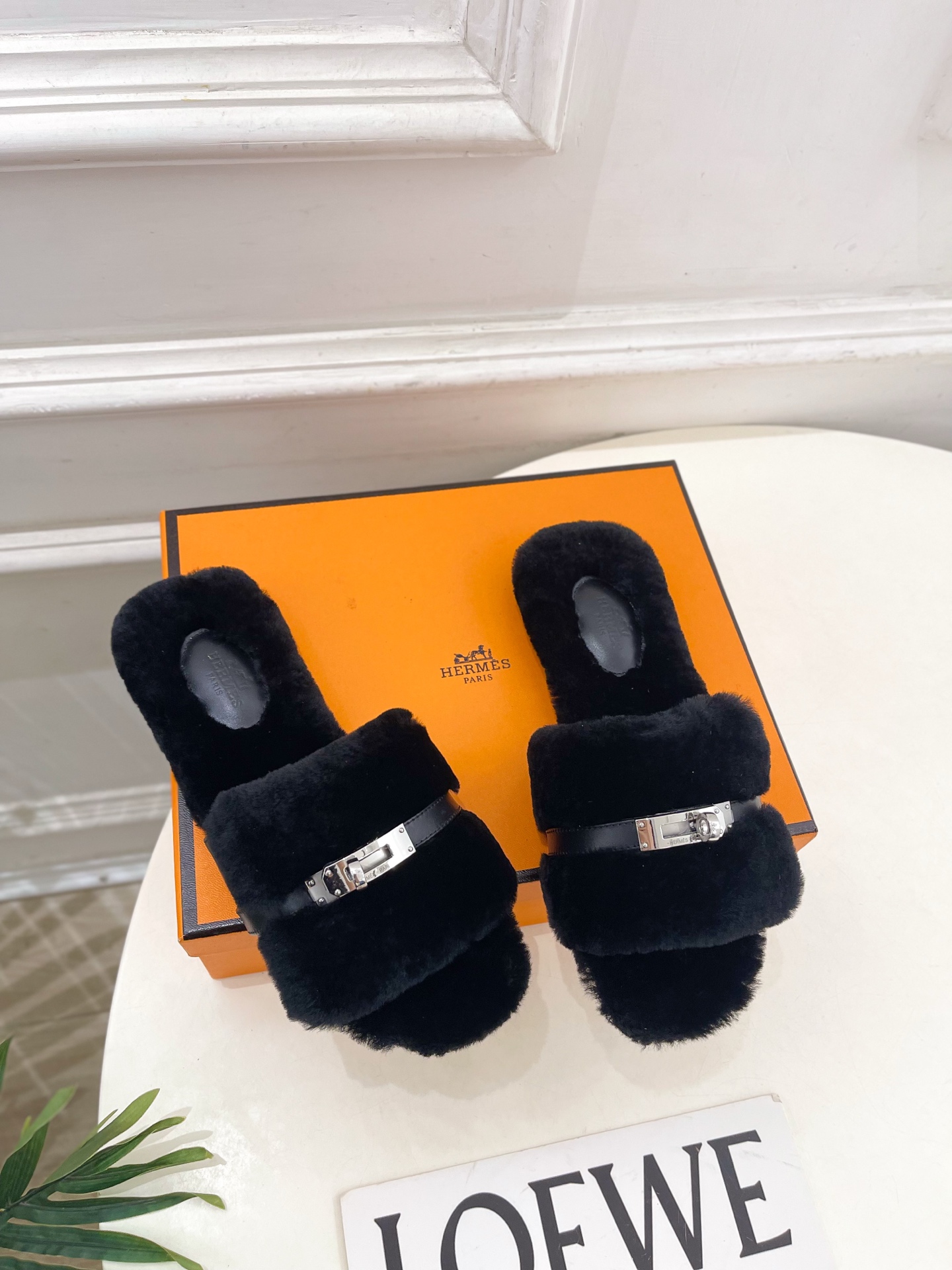 エレガントな HERMES フェイクファー フラットサンダル 黒 37サイズ 素材: フェイクファー・レザー 靴底にゴールドロゴ イタリア製 🐎